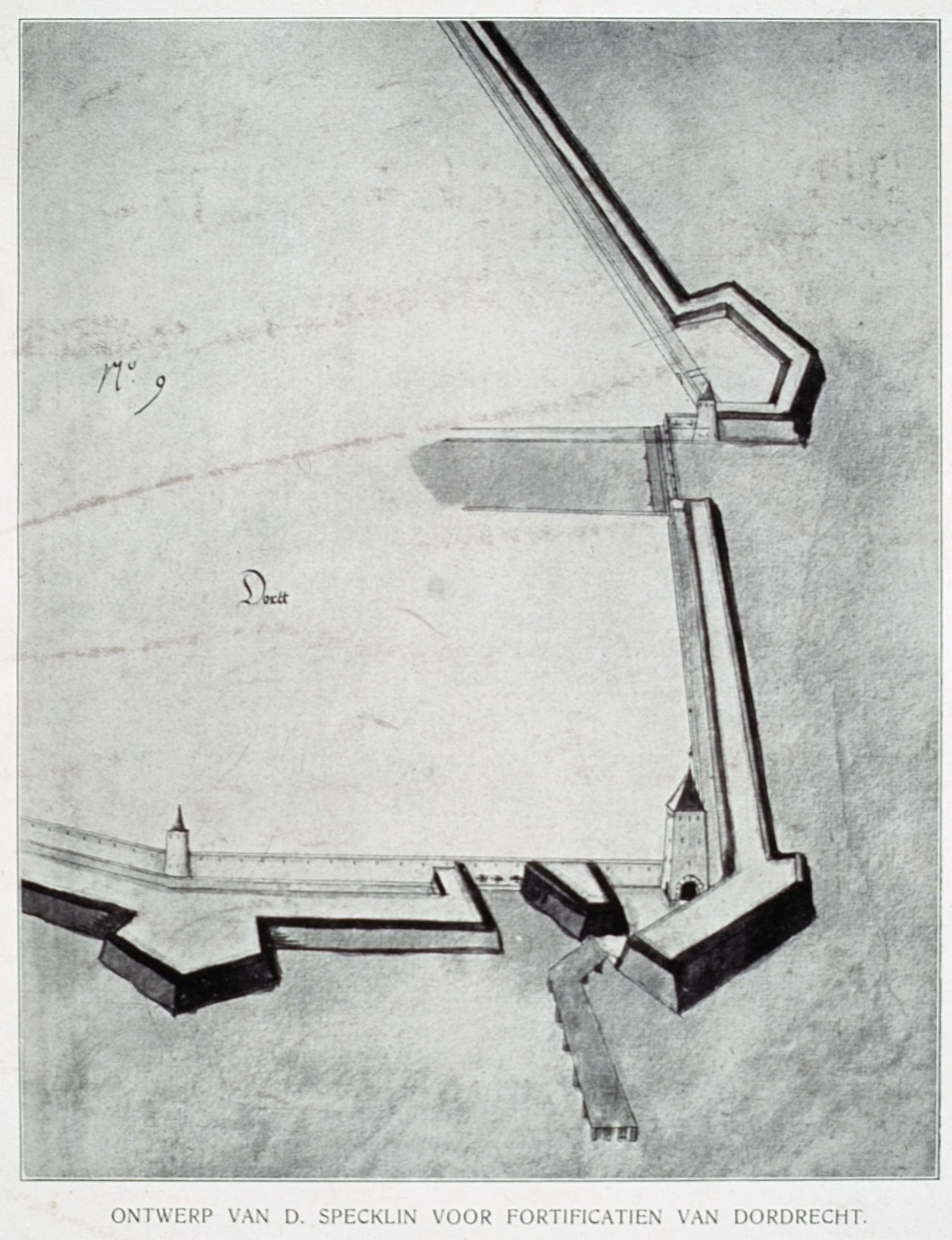 Dit nooit uitgevoerde plan is ontworpen door de Straatsburger stadsbouwmeester Daniël Specklin die op last van de Raad van die stad in 1577 en 1578 een studiereis door de Nederlanden maakte en in oktober 1577 te Antwerpen aankwam; vandaar begaf hij zich naar Zevenbergen, Dordrecht, Utrecht, Buren en Coevorden en keerde langs de Rijn terug