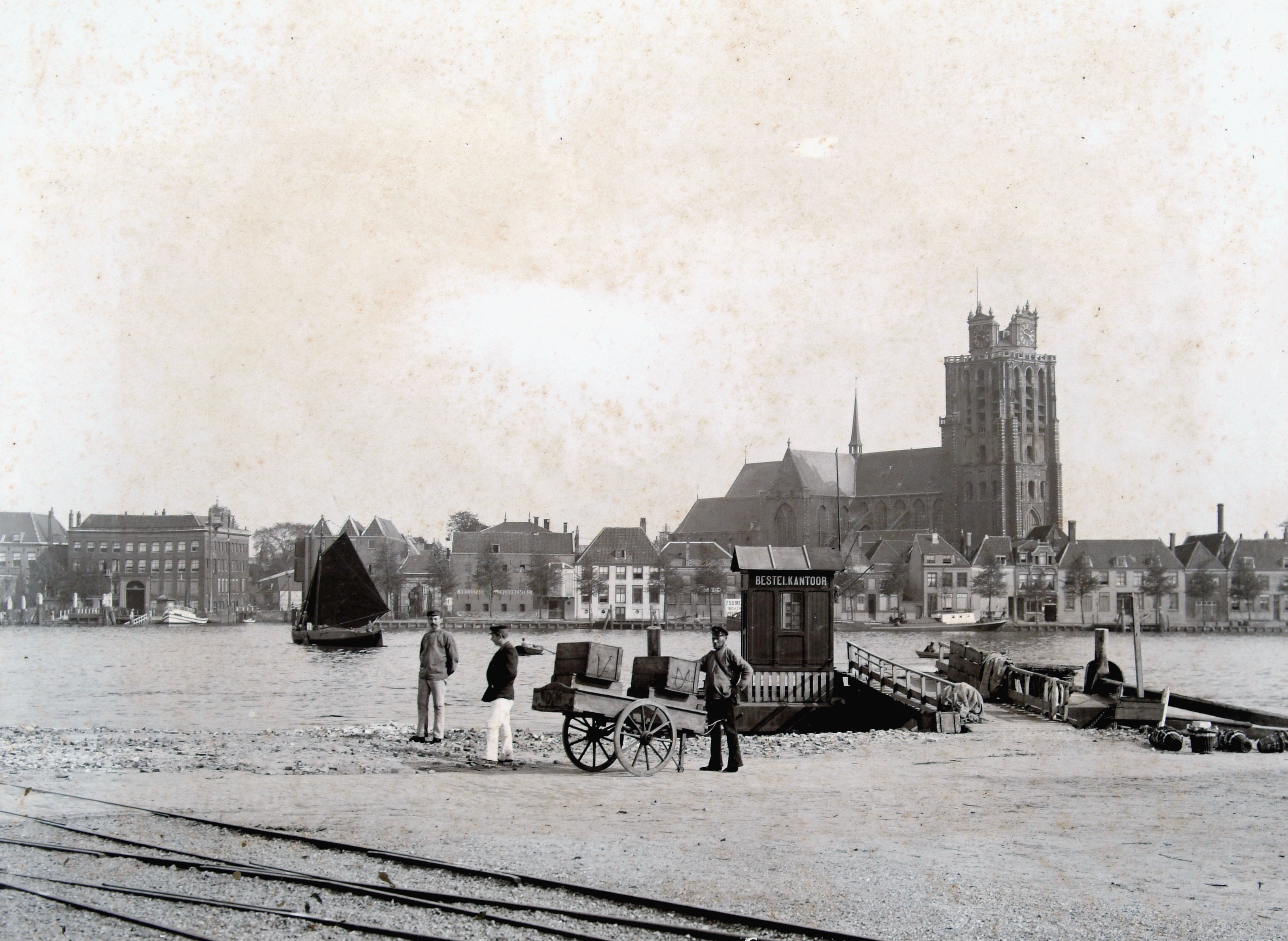 Gezicht op Dordrecht vanaf Zwijndrechtse oever. Links de Blauwpoort aan de monding van …