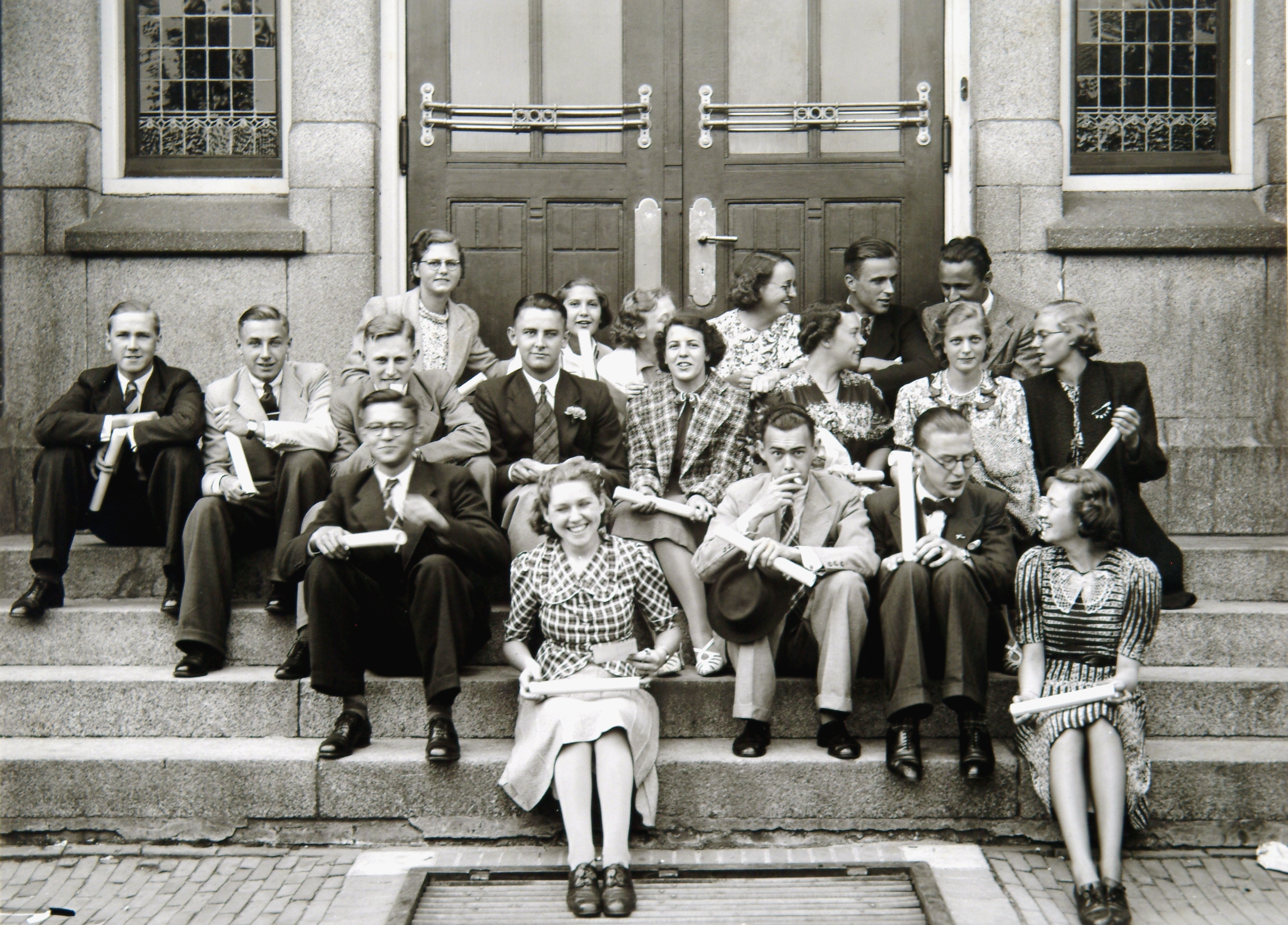 Geslaagden voor het diploma H.B.S.-A voor hun schoolgebouw in het Oranjepark.