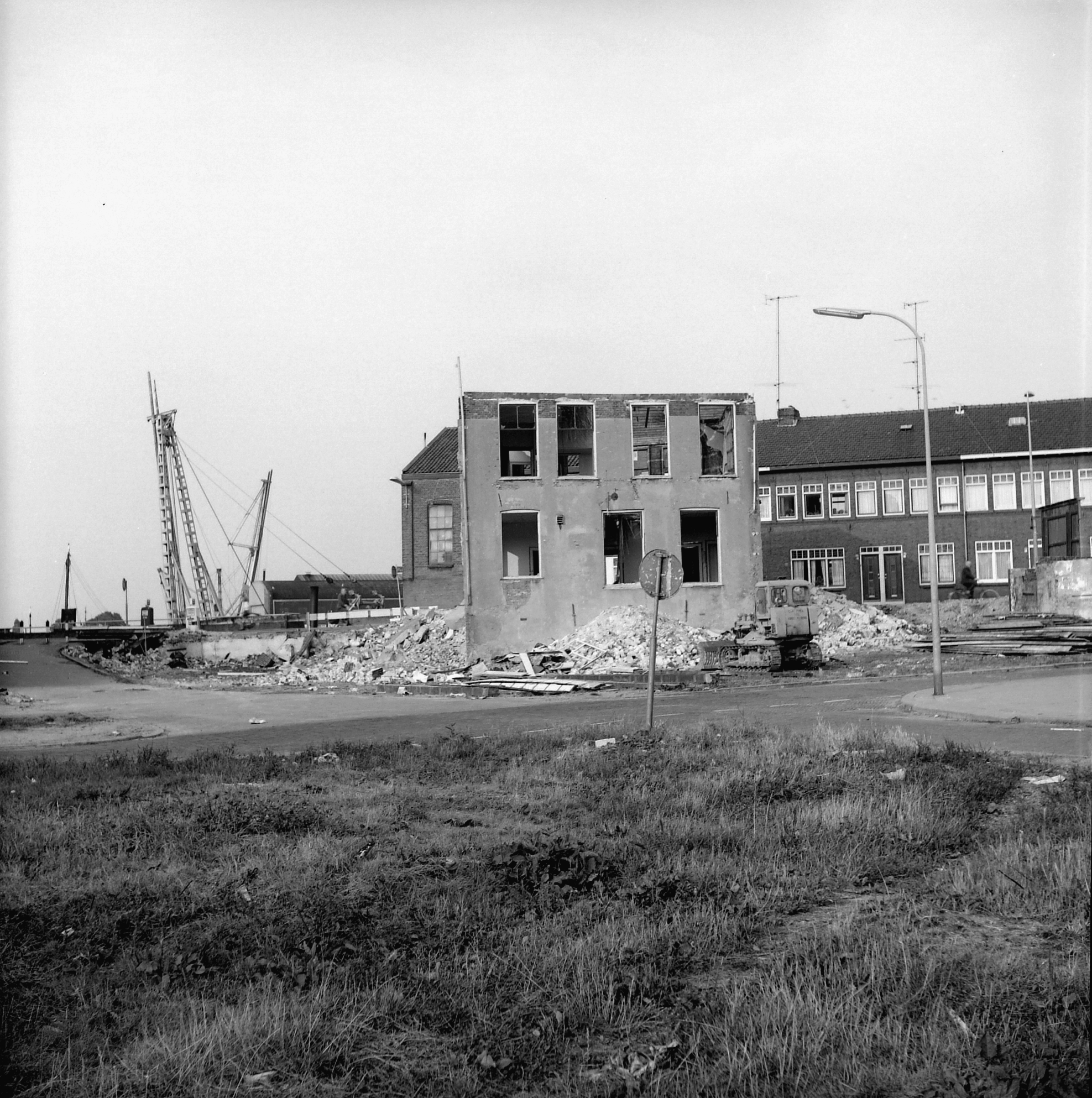 - Sloop van woningen aan de Veststraat. Kruising met de Kattengang. De woningen erachter zijn van de Vest. Het grote raam is van rederij Muller