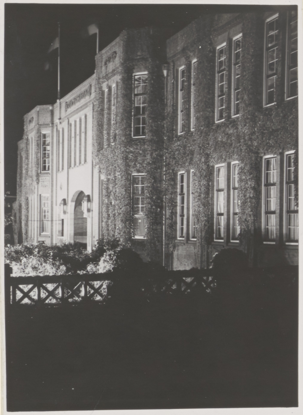 - De Ambachtsschool aan Reeweg Oost bij haar vijftig jarig bestaan in floodlight.