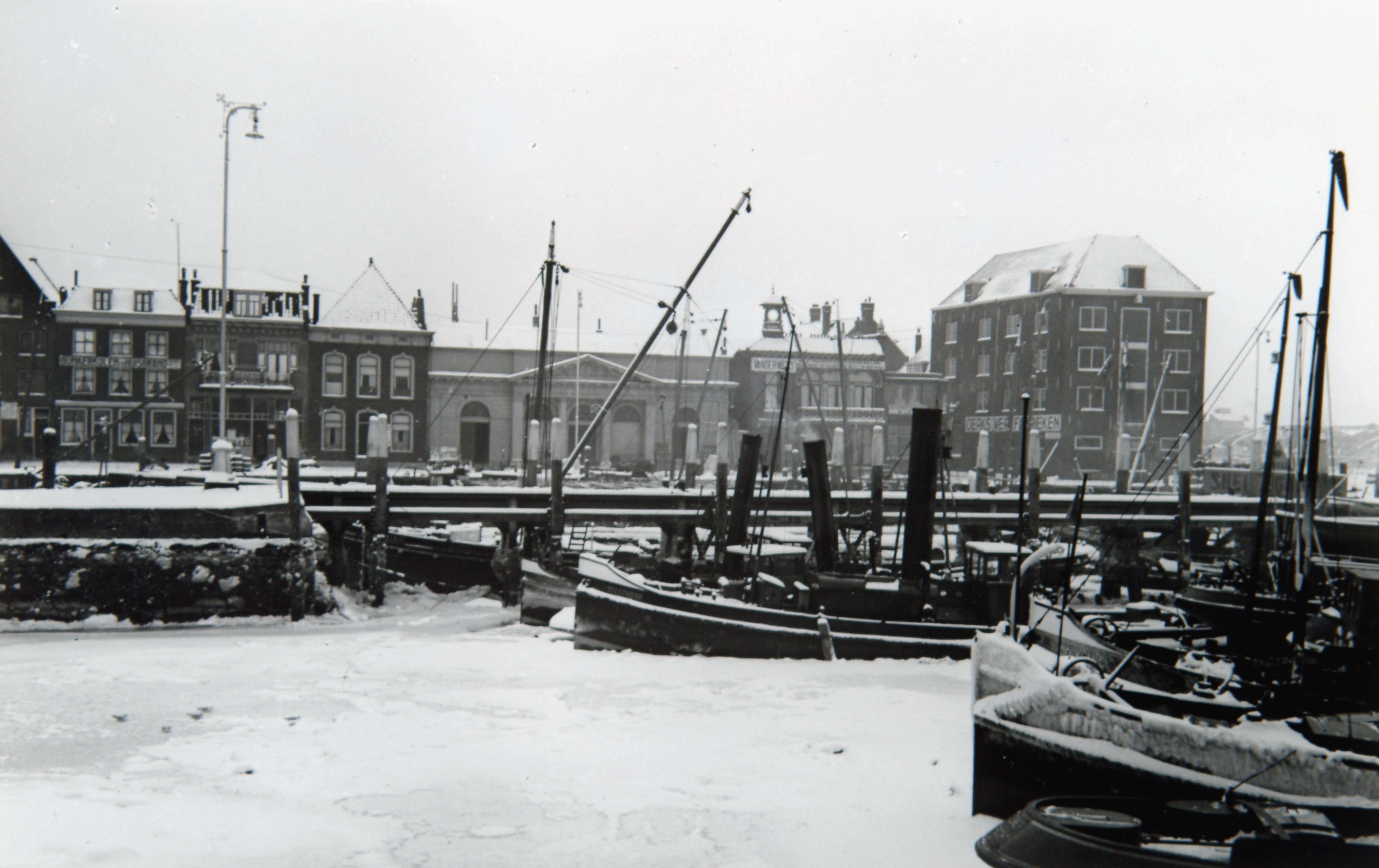 - Gezicht op de westzijde van de Bomkade. Uiterst rechts Derks' verffabriek, in het midden de (voormalige) Korenbeurs.