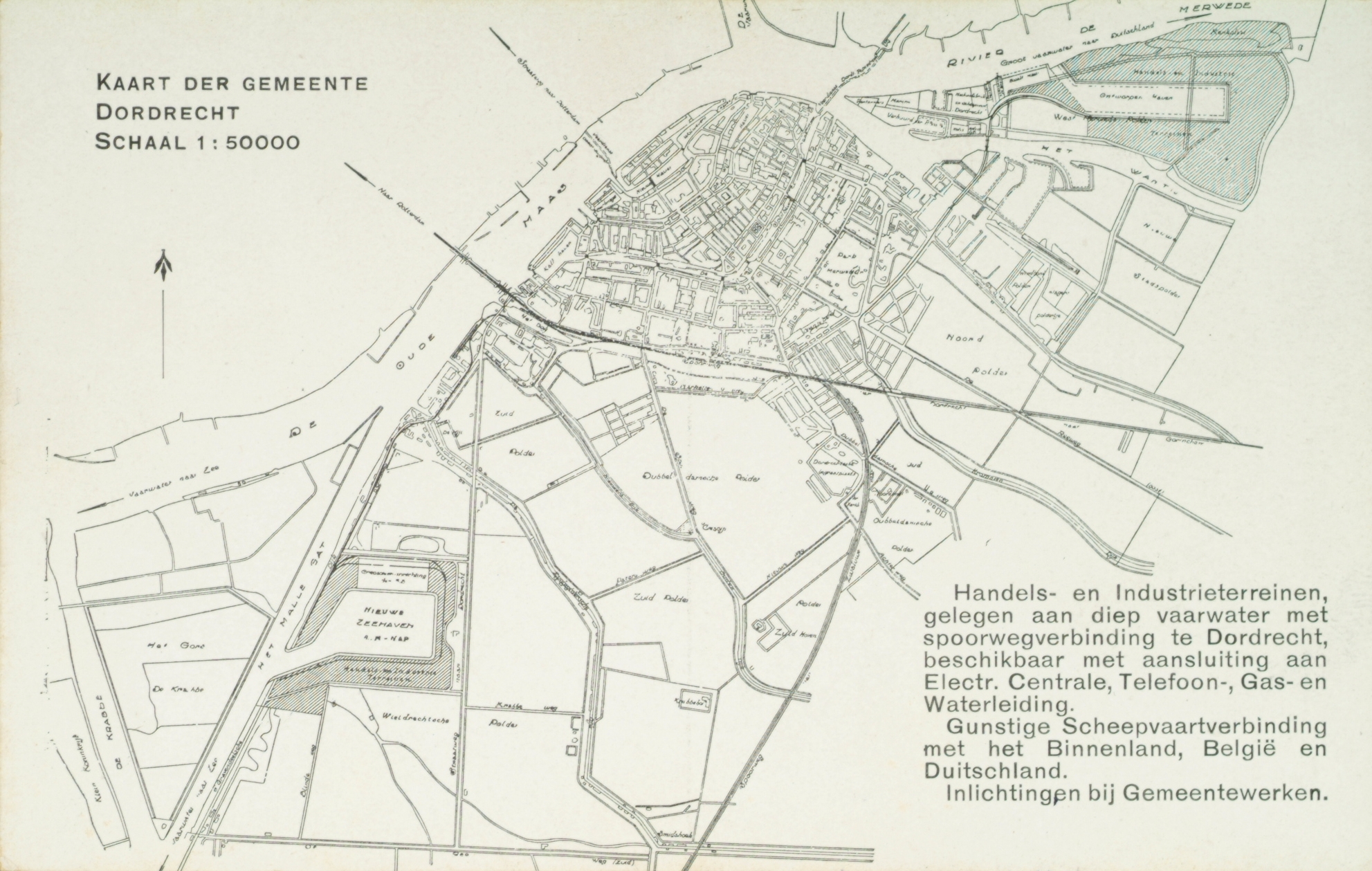 - Reclame van Gemeentewerken met plattegrond van Dordrecht voor de promotie van industrieterreinen in de stad.