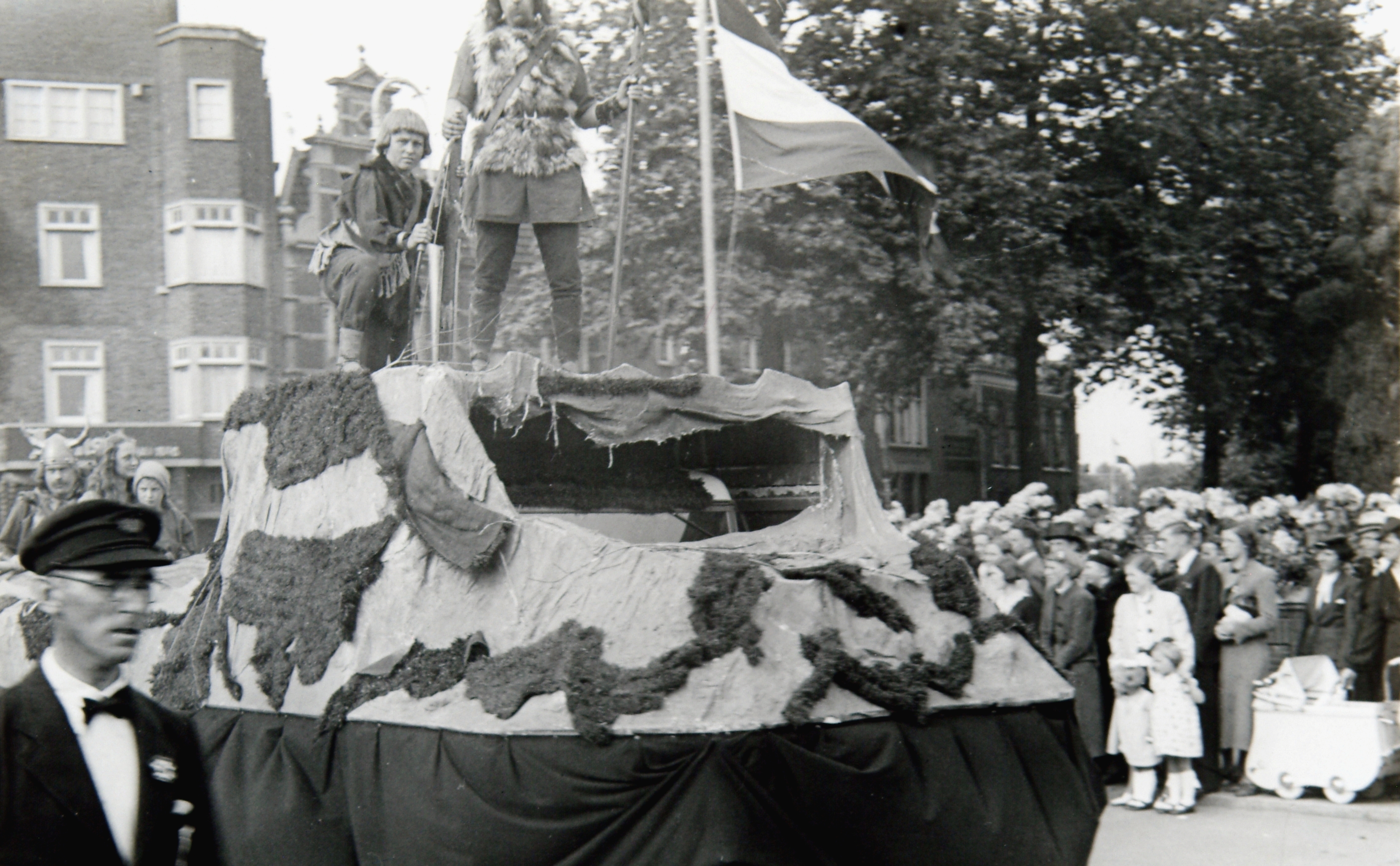 Praalwagen met Batavieren in een optocht op de Johan de Wittbrug tijdens de opening van …