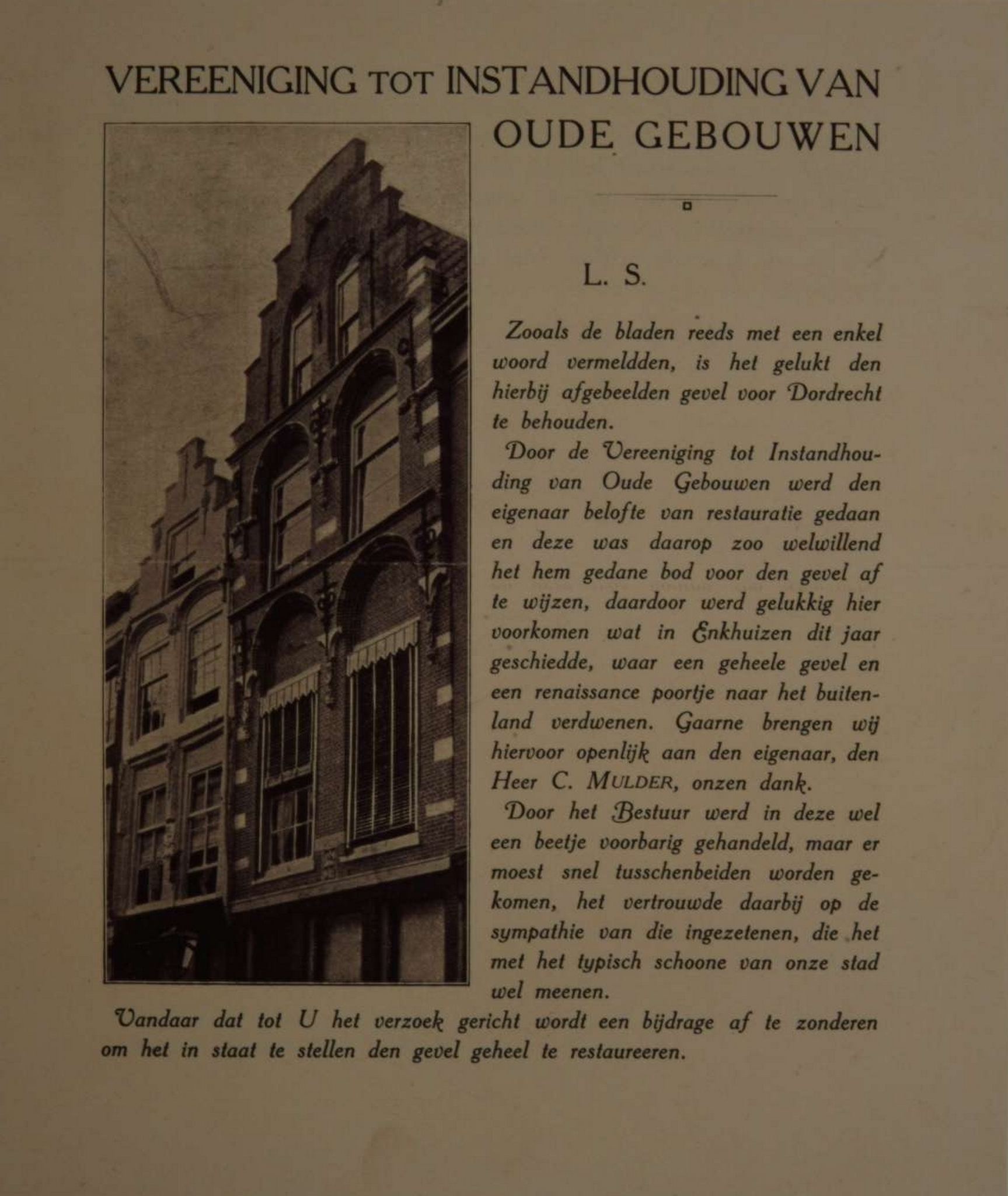 - Bovendeel van gevel Huis De Sleutel, als illustratie bij een artikel voor het inzamelen van geld t.b.v. restauratie van dit pand door de Vereeniging tot Instandhouding van Oude Gebouwen.