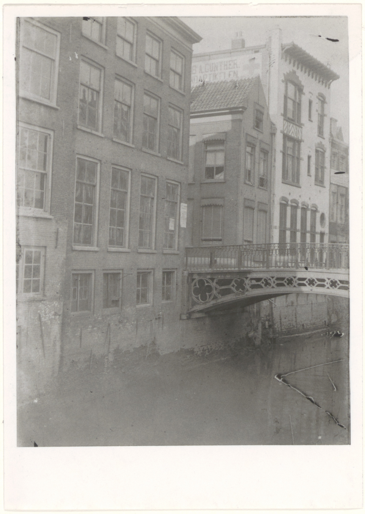 De Voorstraatshaven met de Visbrug vóór de verbreding in 1902 aan de zijde van de Groenmarkt. De gevel van het huis links naast de brug is beplakt met affiches over de uitverkoop wegens de verbreding; het witte pand is dat van de opticien Günther.