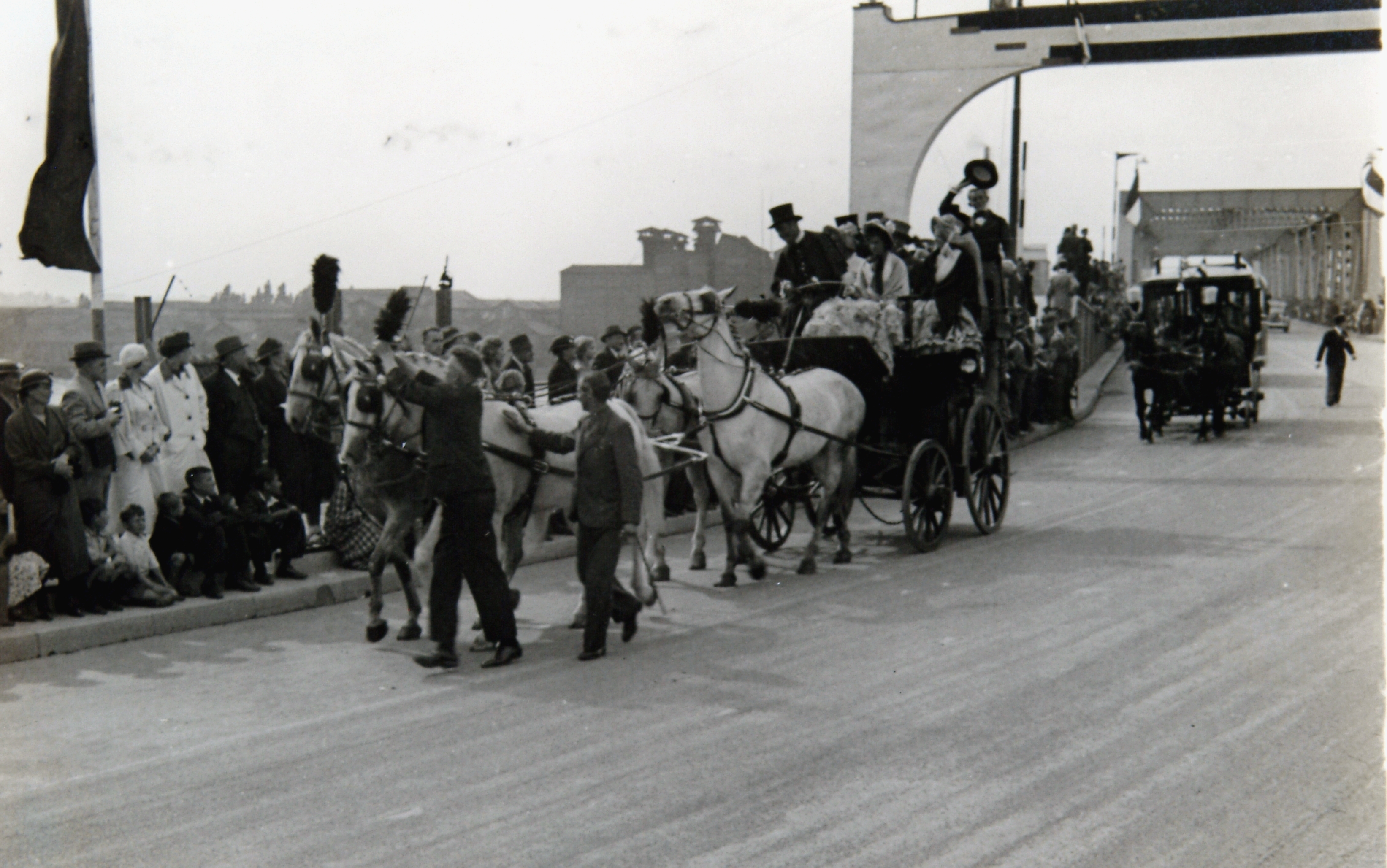 Coach met vier paarden in de optocht op de oprit bij de opening van de verkeersbrug over de Oude Maas.