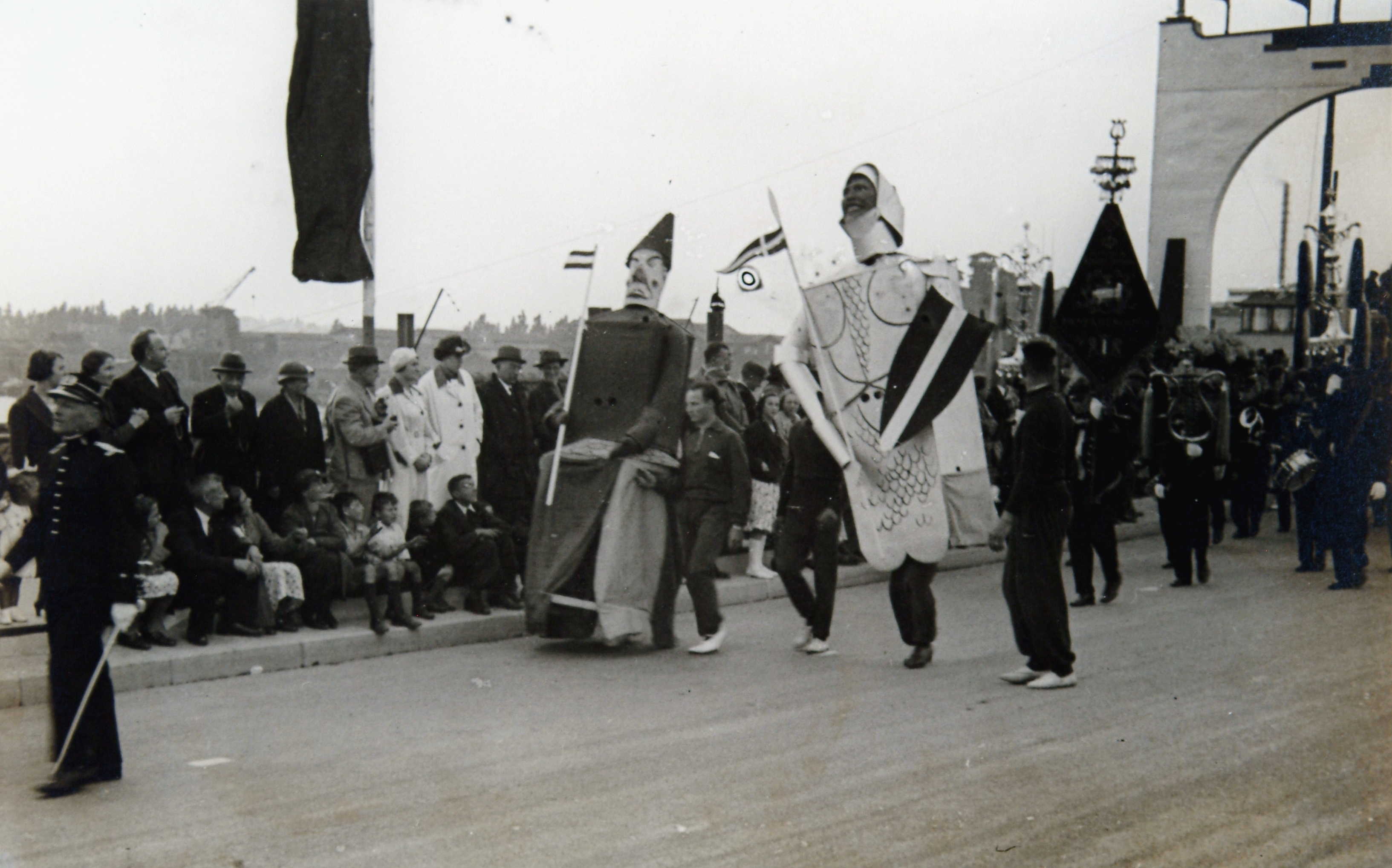 - Optocht op de oprit bij de opening van de verkeersbrug over de Oude Maas. Het stelt voor: Hanneken, de reuzin en legendarische bewaakster van de stad en Bamberg, de reus, de ridderlijke kamprechter en wimpeldrager van Dordrecht.