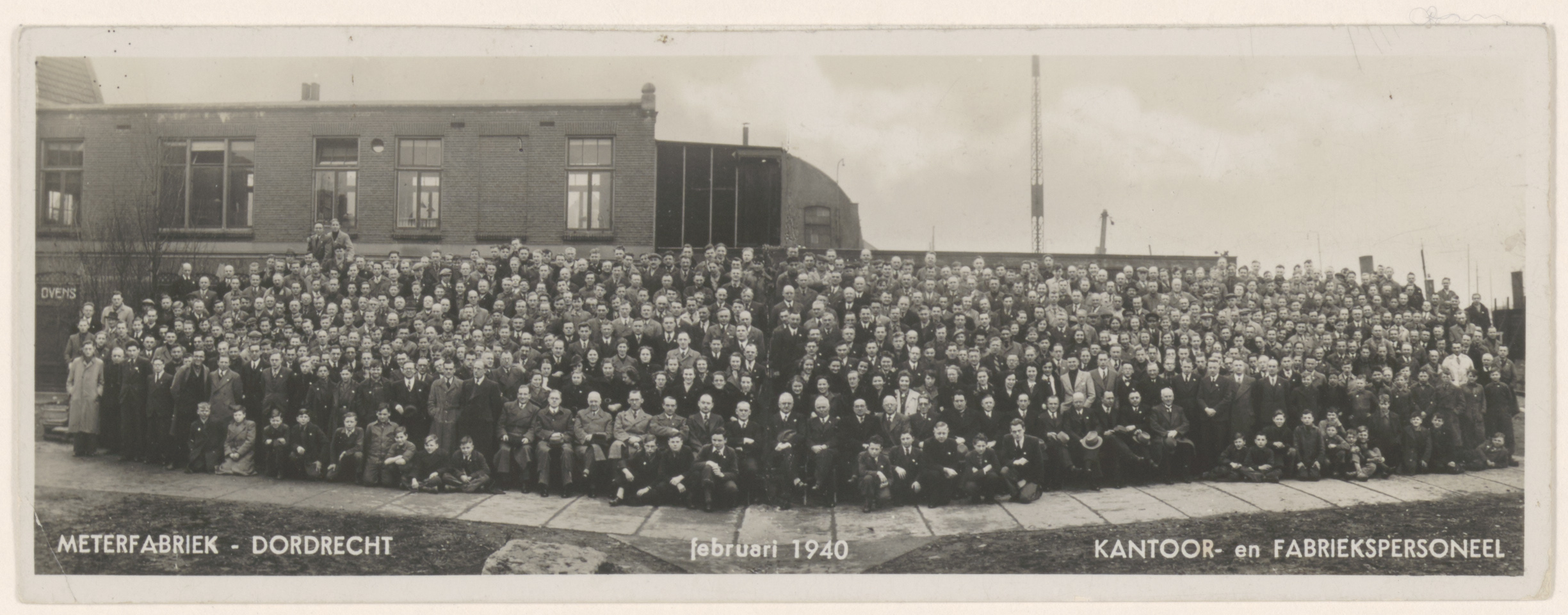 Het kantoor- en fabriekspersoneel van de Meterfabriek opgesteld voor de fabriek aan de …