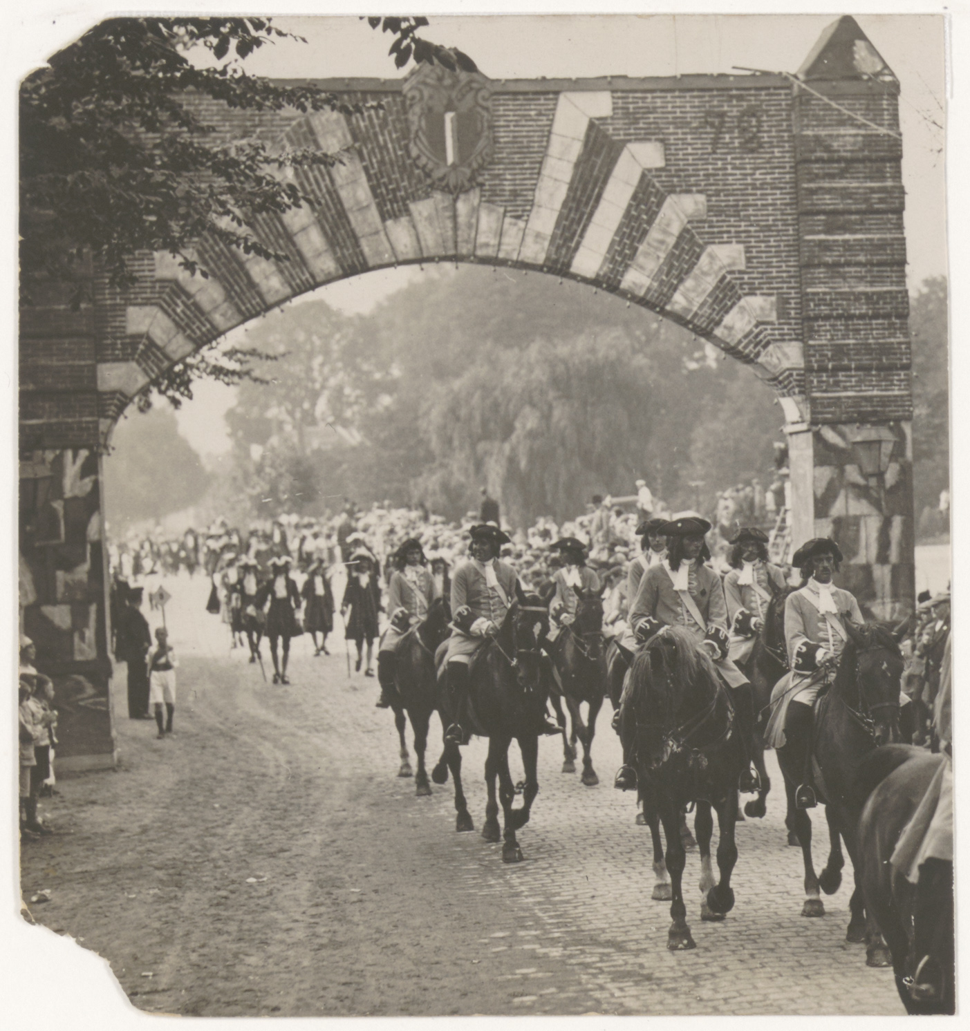 Historische optocht tijdens Koninginnedag met de voorstelling van de intocht van Willem III op 29 juni 1672 bij de opgerichte erepoort op Reeweg Oost ter hoogte van het Sumatraplein (rechts).