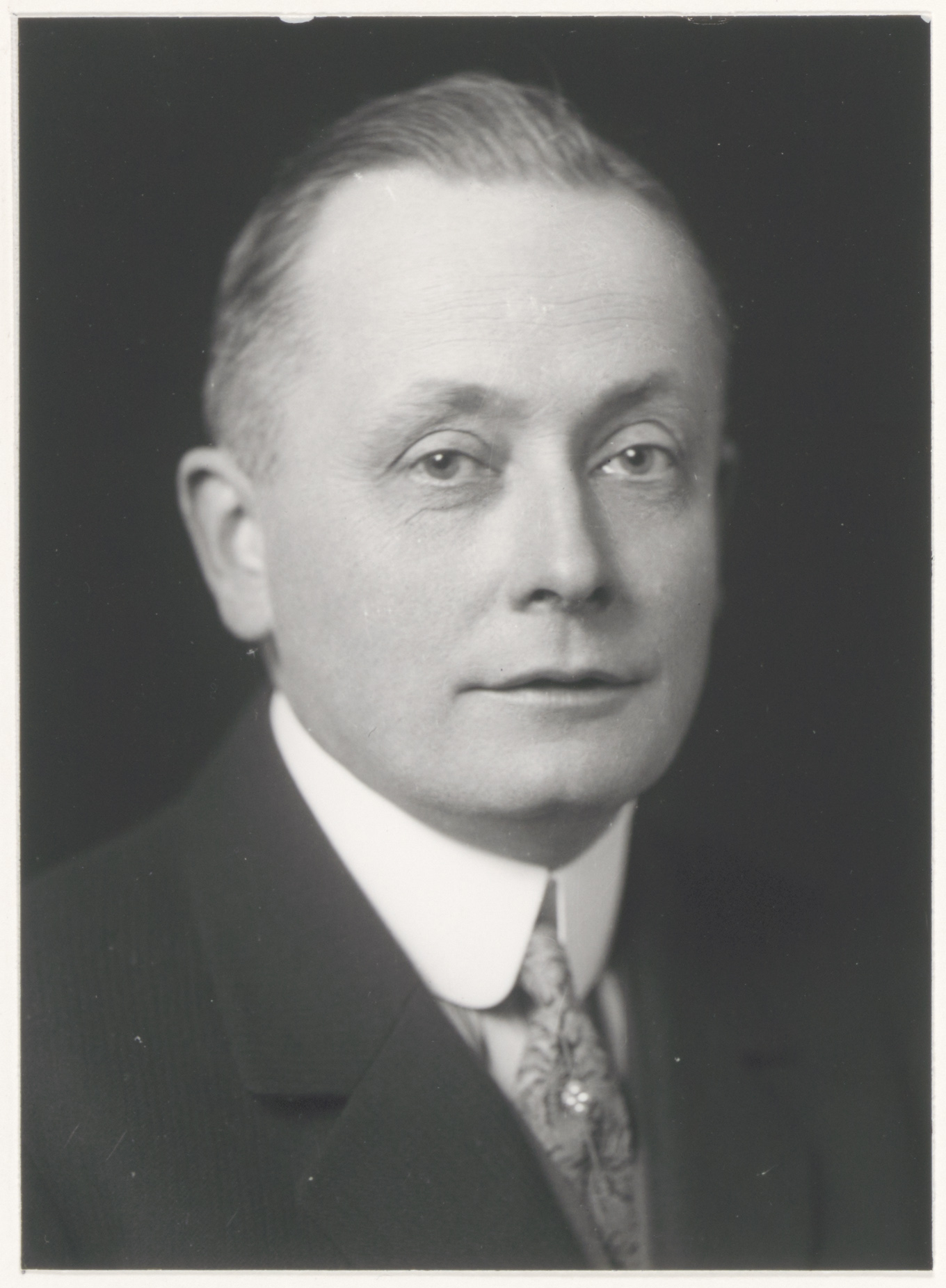 - Borststuk naar rechts van G.F. de Roo van Westmaas, burgemeester van Dubbeldam van 1914 tot 1945, in burger met das en dasspeld.