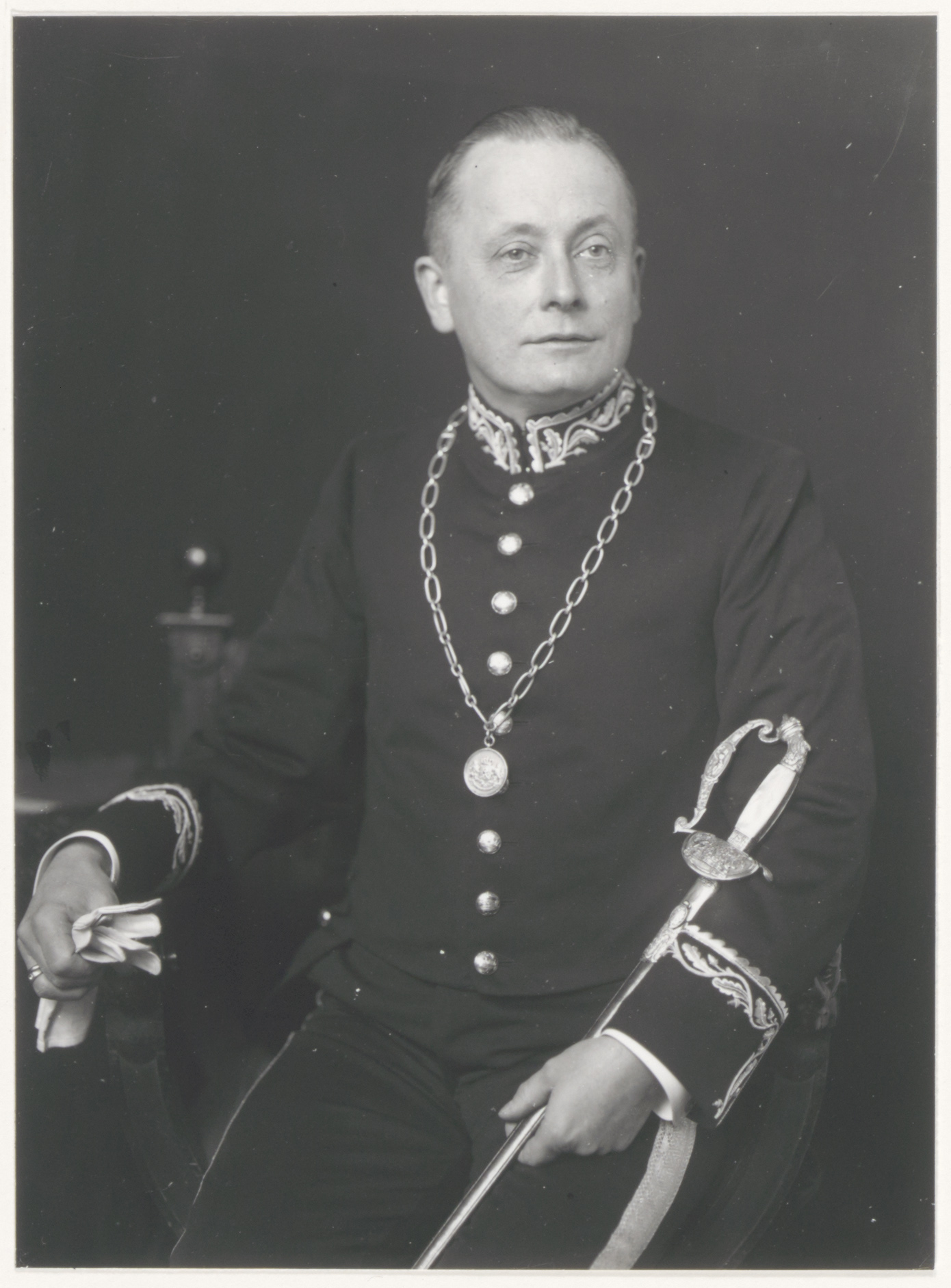 - Kniestuk naar links, het hoofd naar rechts, van G.F. de Roo van Westmaas, burgemeester van Dubbeldam van 1914 - 1945, zittend, in uniform met sabel, handschoenen in rechterhand en ambtsketen.