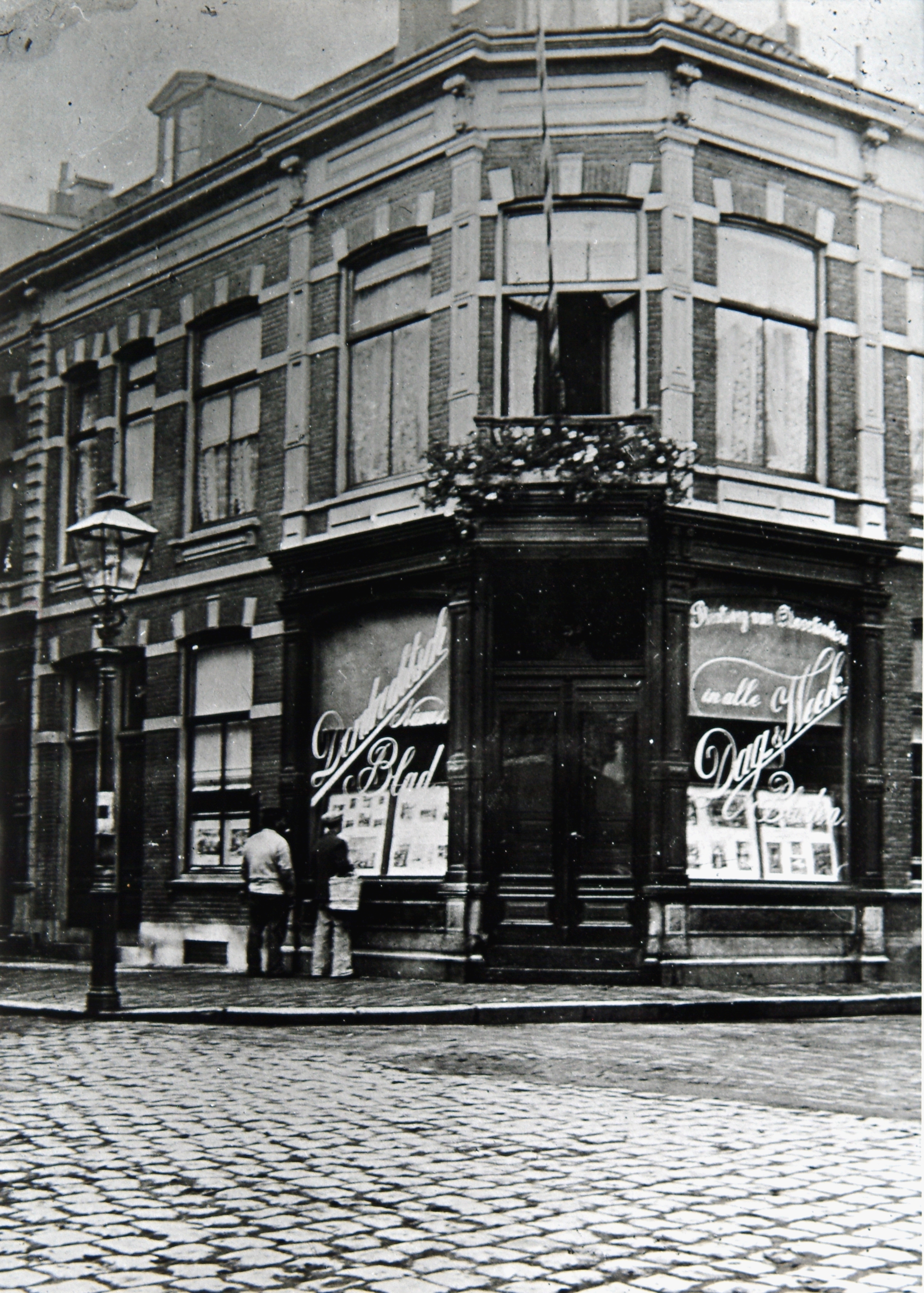 - Gezicht op het pand Bagijnhof / hoek voormalige Raamstraat, waar het Dordrechtsch Nieuwsblad gevestigd was. Ongeveer op de plek waar nu de HEMA is. De Raamstraat liep destijds vanaf het Bagijnhof tot de Nieuwe Hilstraat