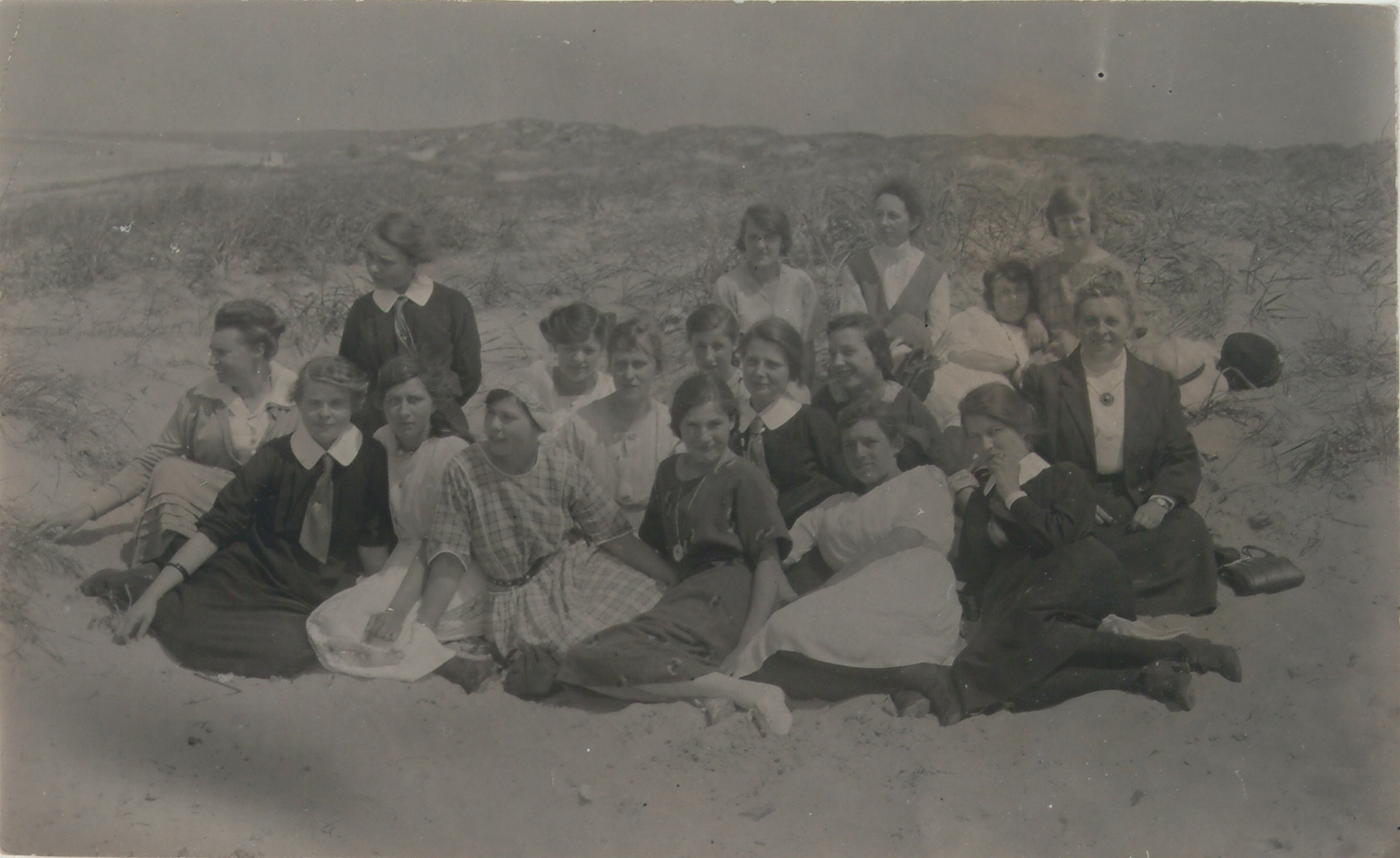 Leerlingen van de Industrie- en Huishoudschool Doelesteyn aan het Steegoversloot tijdens een uitstapje naar Hoek van Holland t.g.v. het 50-jarig huwelijk van het echtpaar Van Gijn, oprichters der school