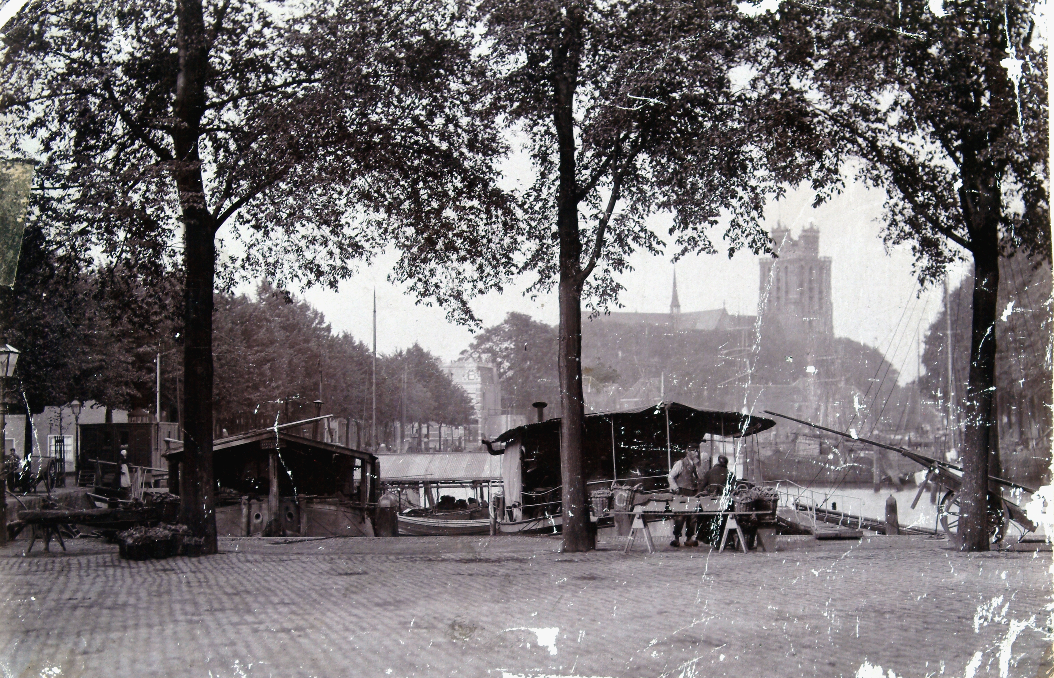 - Nieuwe Haven met de Aardappelmarkt op de voorgrond. Links de Knolhaven met een visvlot.