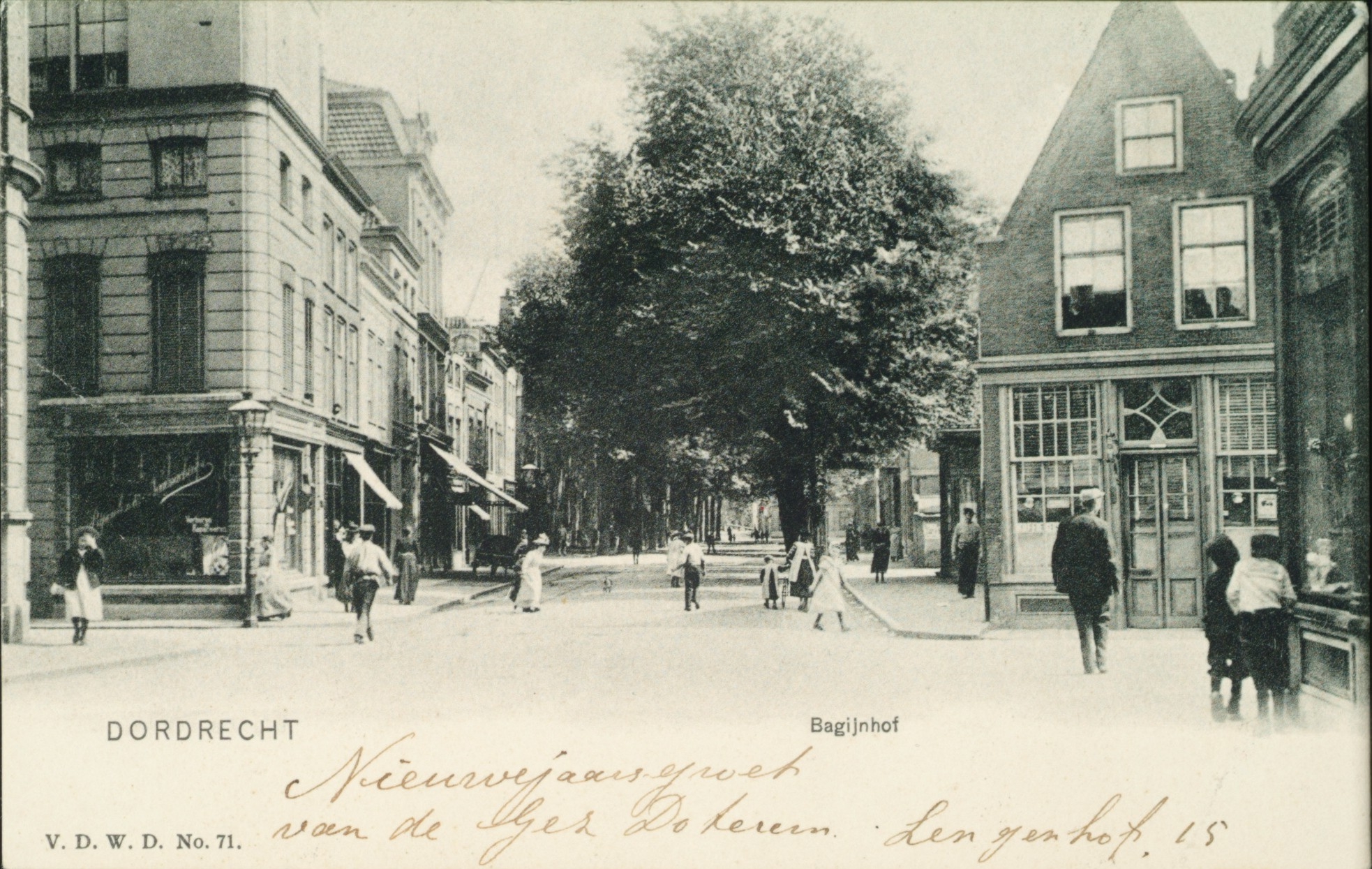 - Het Bagijnhof vanaf de Visstraat bij de hoek van de Korte Breestraat (links) en de Lange Breestraat. Links een rijwielhandel.