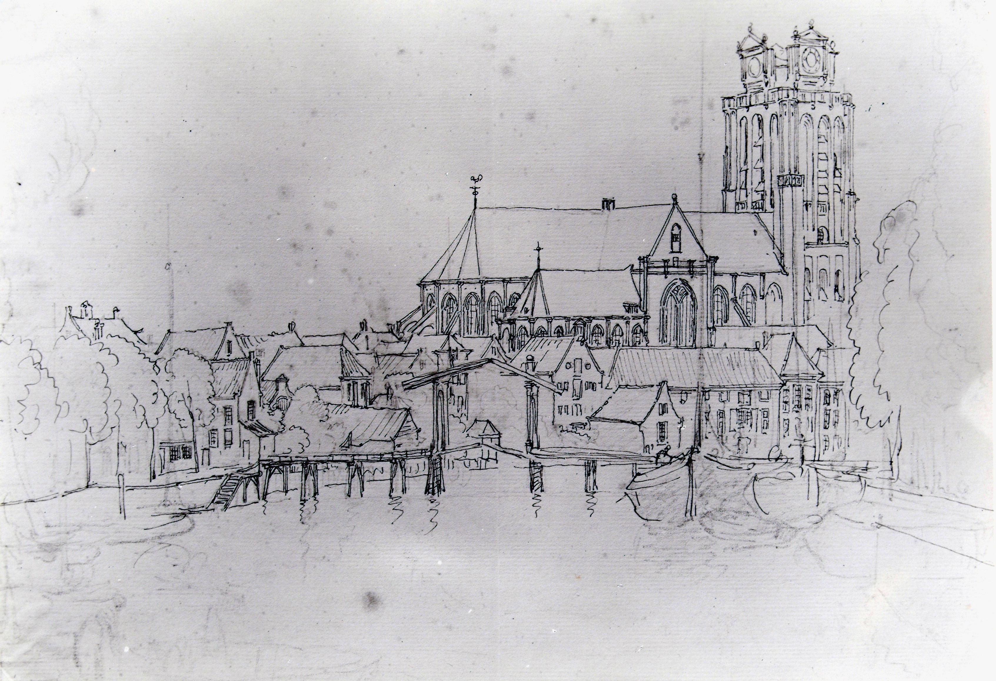 - Tekening van de Nieuwe Haven in de richting van de Lange Houtenbrug en Grote Kerk. Fotografische reproductie van een onvoltooide anonieme pentekening (15,5x22,8 cm).