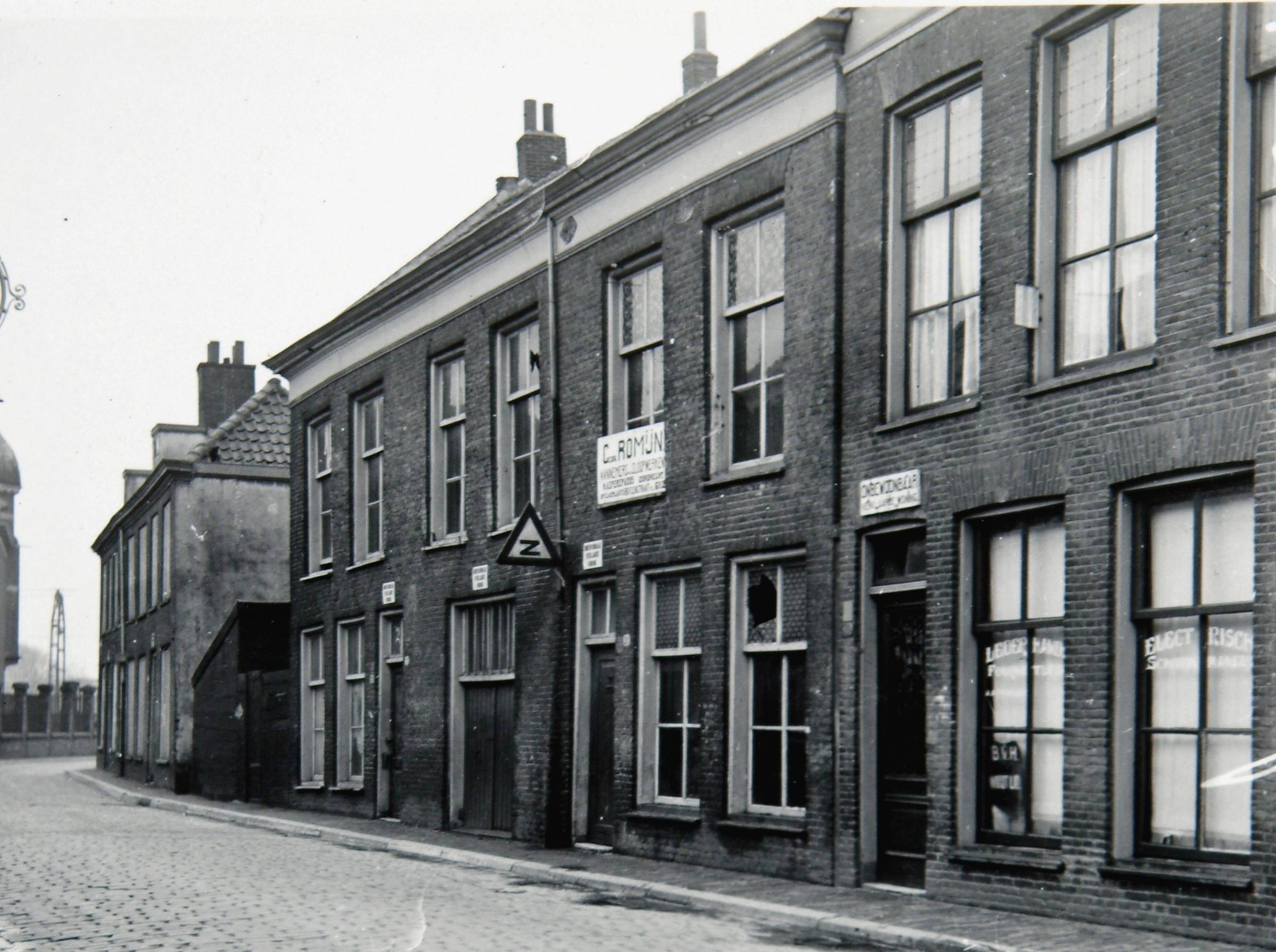 - Gezicht op de westelijke bebouwing van de Hoge Bakstraat vanaf de Hoogt in de richting van de Parallelweg. In het pand uiterst rechts is een lederhandel en elektrische schoenmakerij gevestigd