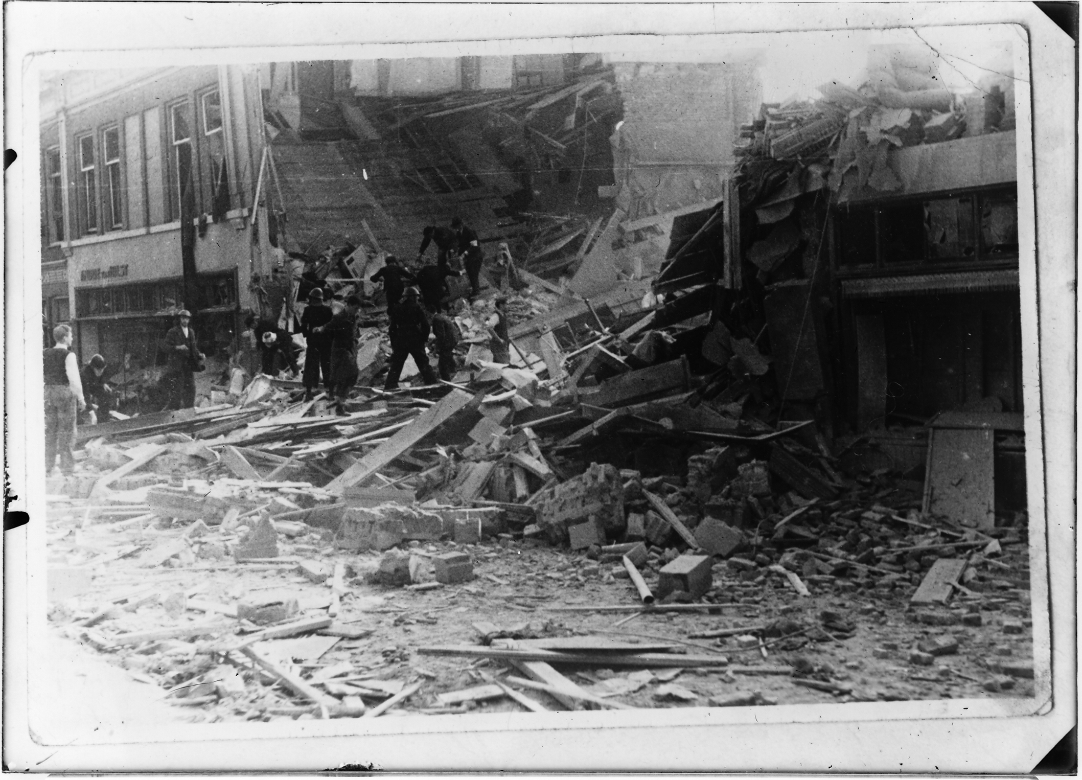Schade op de Vrieseweg bij de ingang van de Clara en Mariahof door het bombardement op …