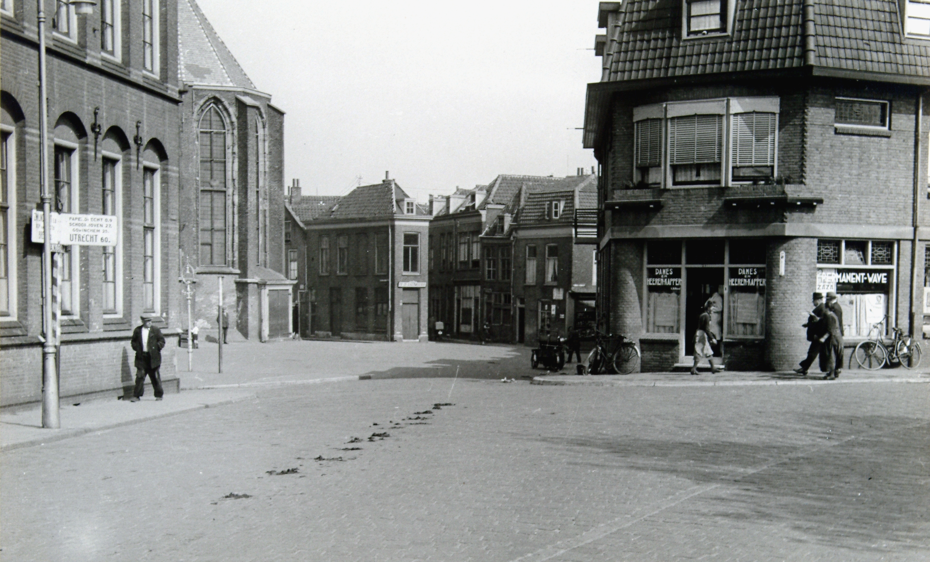 Nieuwkerksplein vanaf de Vest, rechts de Bleijenhoek. In het midden van de foto bij de …