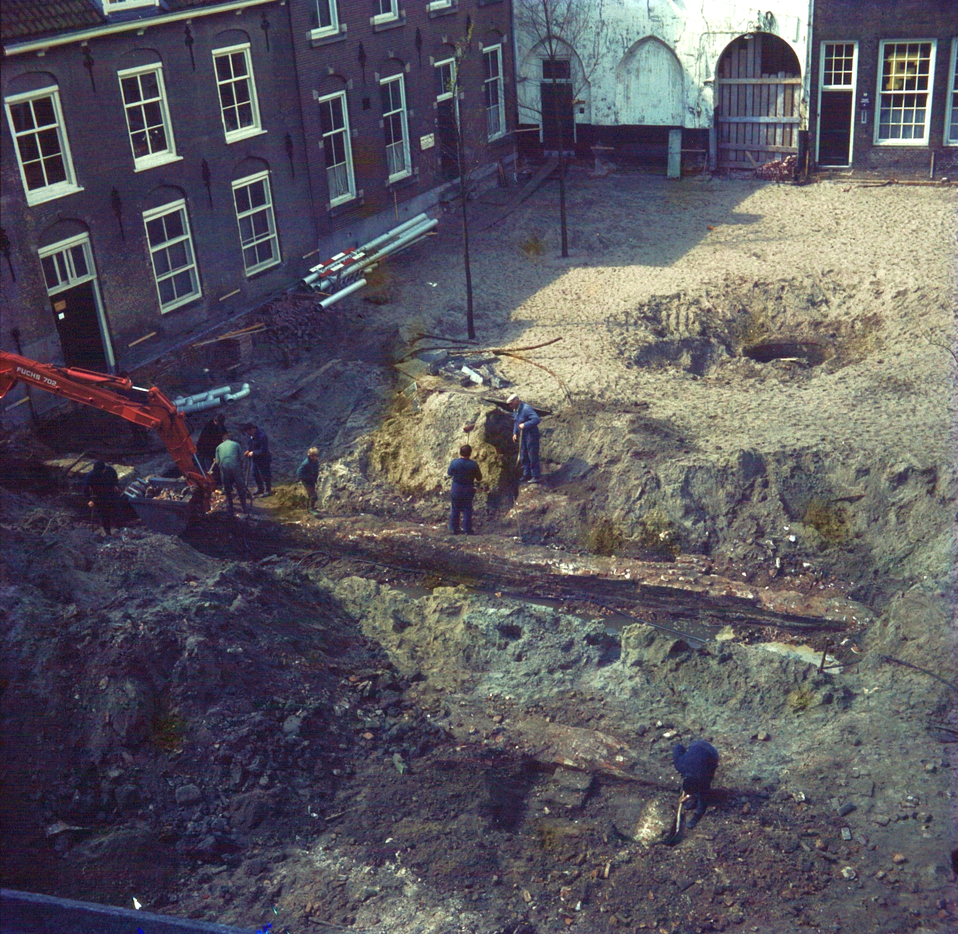 De opgraving van de fundering van de kloostergang en de waterput, in het Hof.