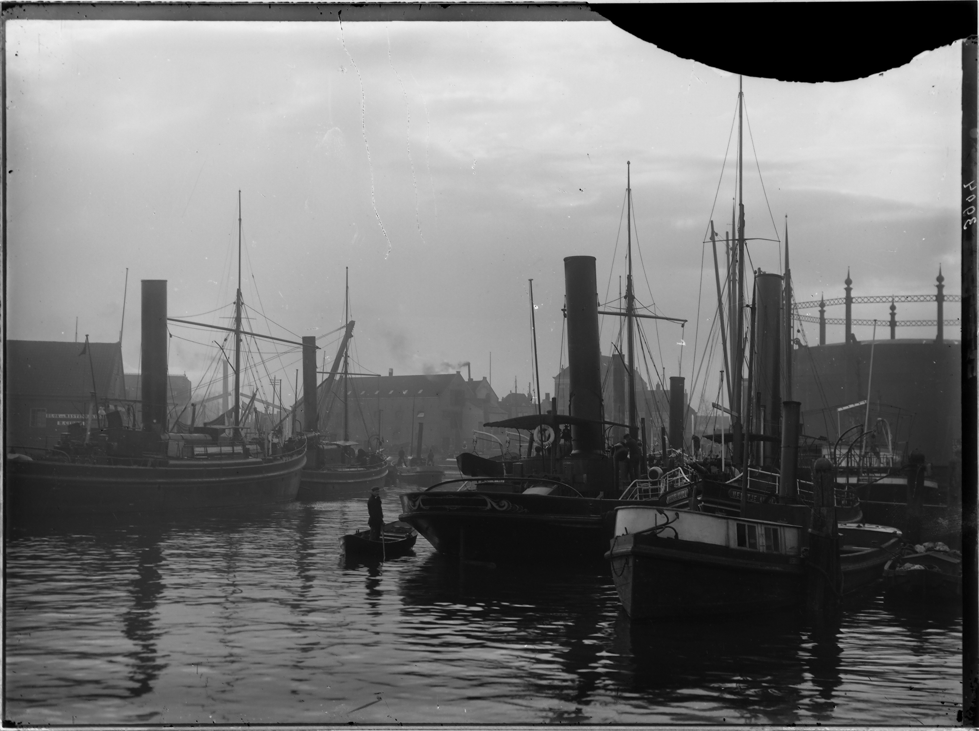 - Stoomsleepboten in de Riedijkshaven gezien naar de Noordersluisbrug; rechts een gashouder van de gasfabriek aan de Bleijenhoek