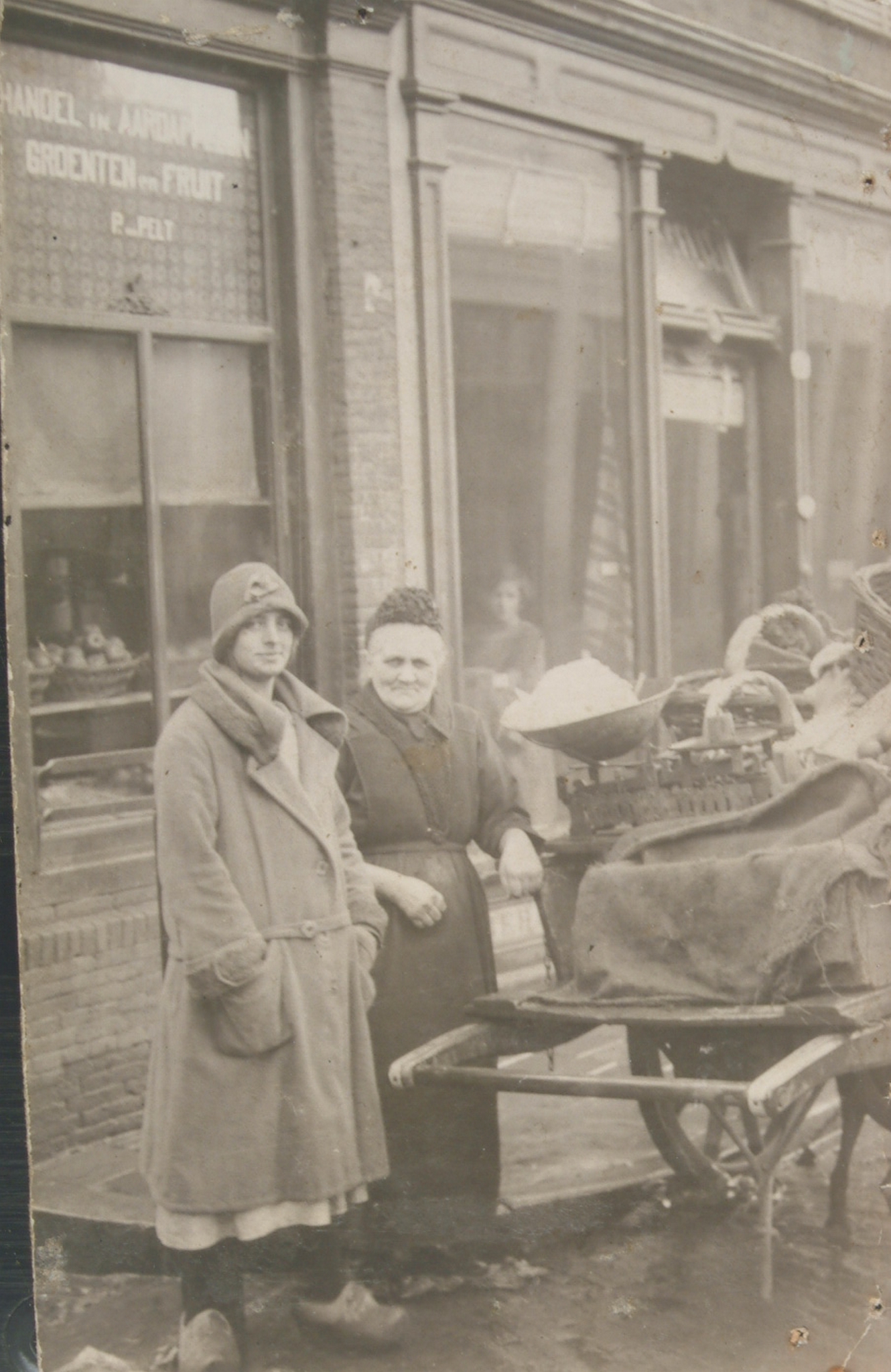 - Zwijndrechtse groentevrouw Pietje van Pelt met dochter Willempje voor haar groentewinkel met handkar op de hoek Torenstraat Voorstraat