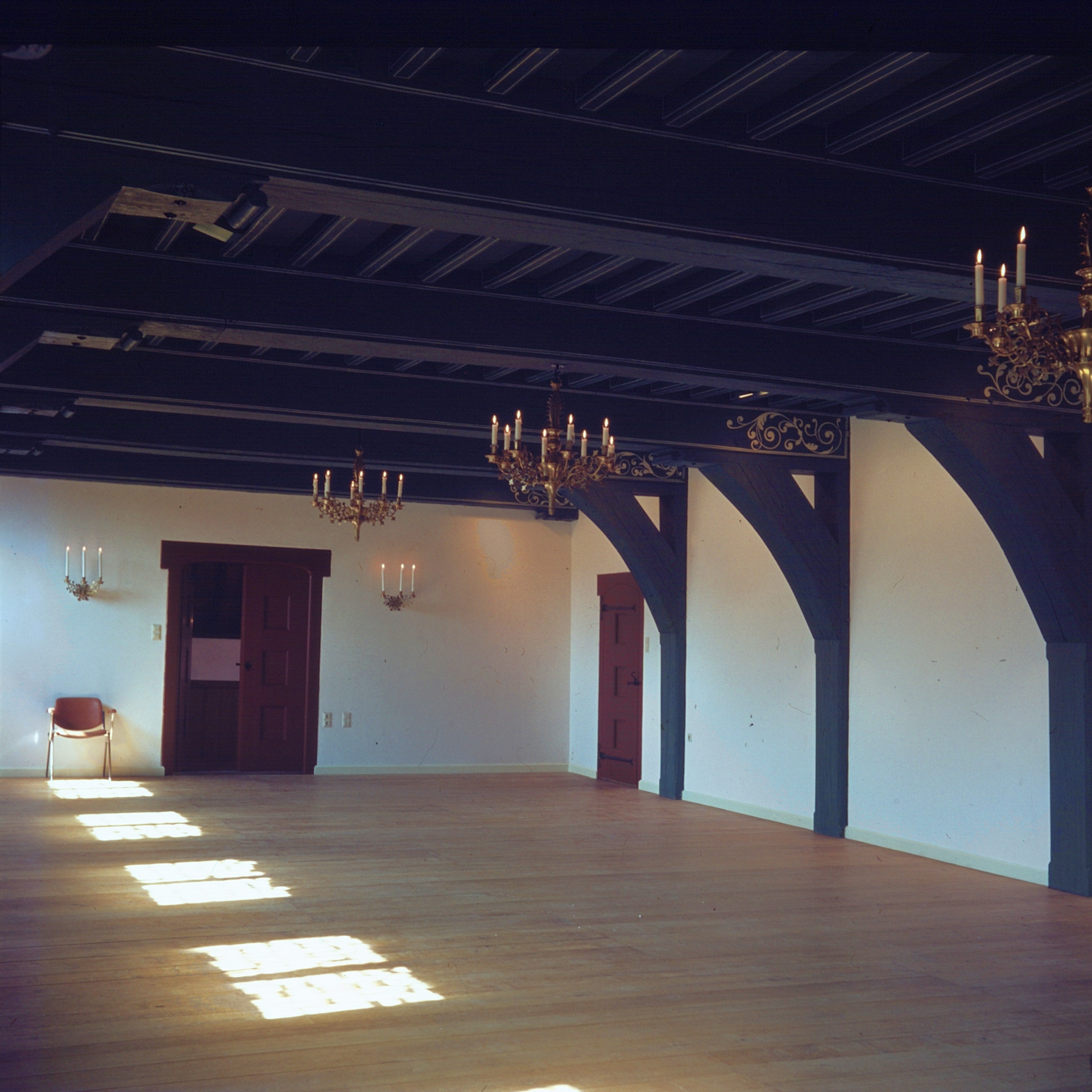 - De dormter (vroegere slaapzaal) met het versierde balkenplafond in Renaissance stijl en de mooie kroonluchters.