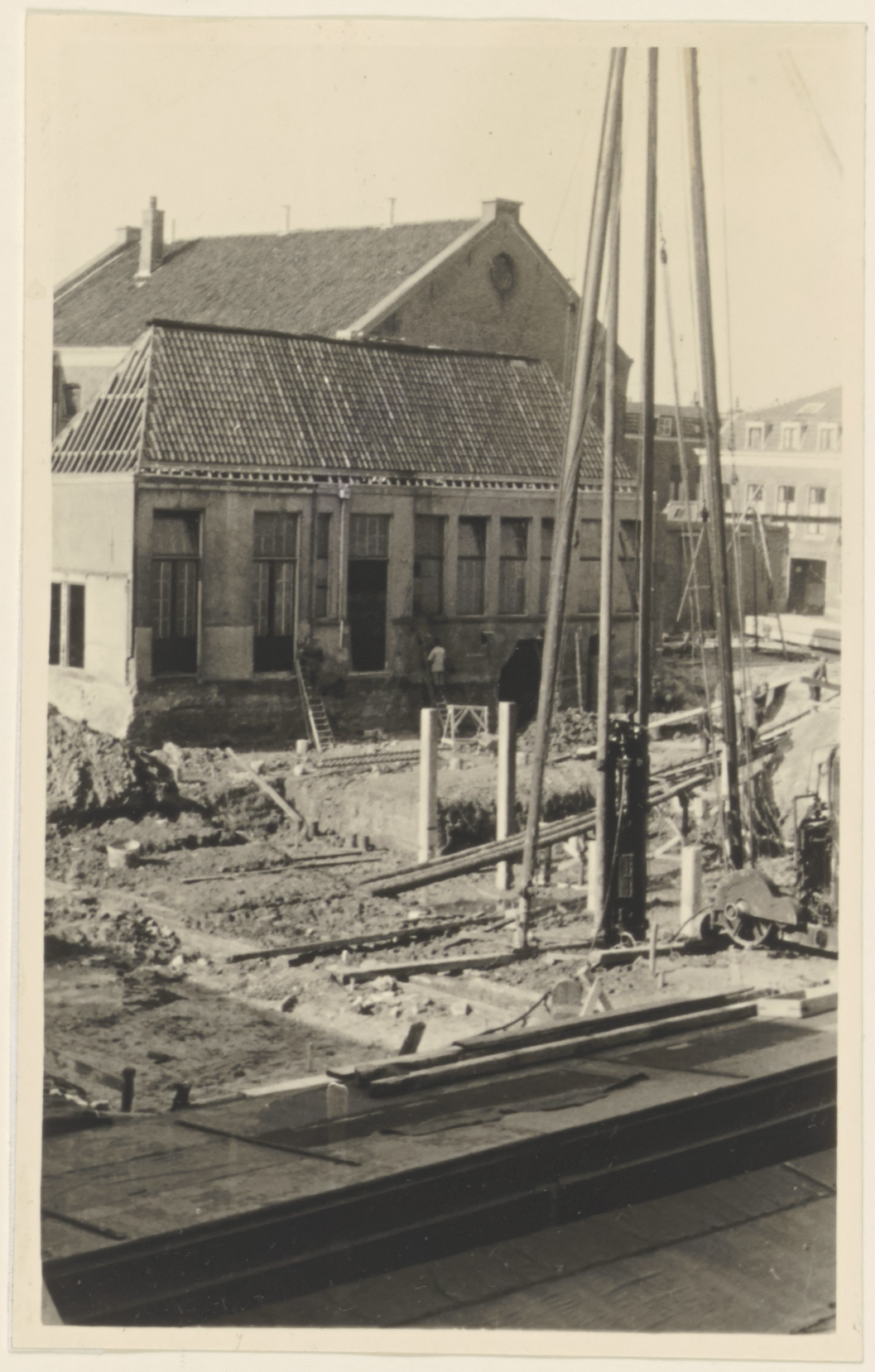 Bouw van een nieuw schoolgebouw aan het Stek, achter de Industrie- en Huishoudschool aan het Steegoversloot. Op de voorgrond de kleuterschool, daarachter het huis van bewaring.