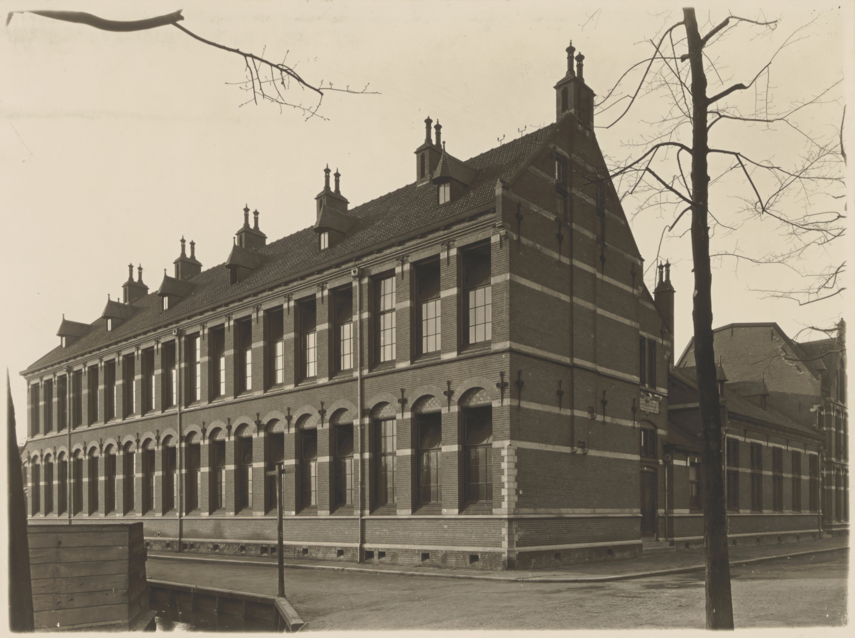 Schoolgebouw op de zuidhoek van de Steltenstraat en de Godfried Schalckensingel (rechts).