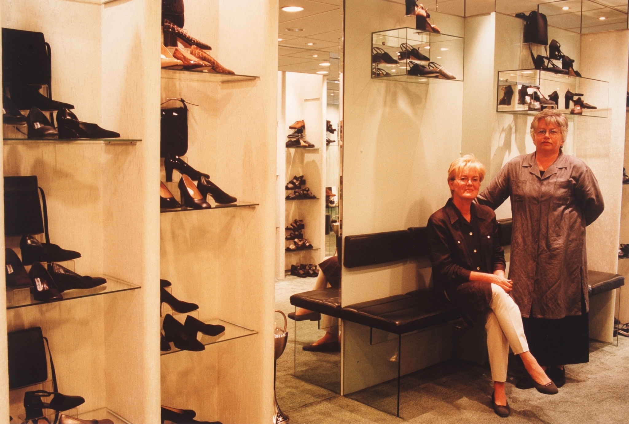 - Interieur van een schoenenwinkel met twee verkoopsters