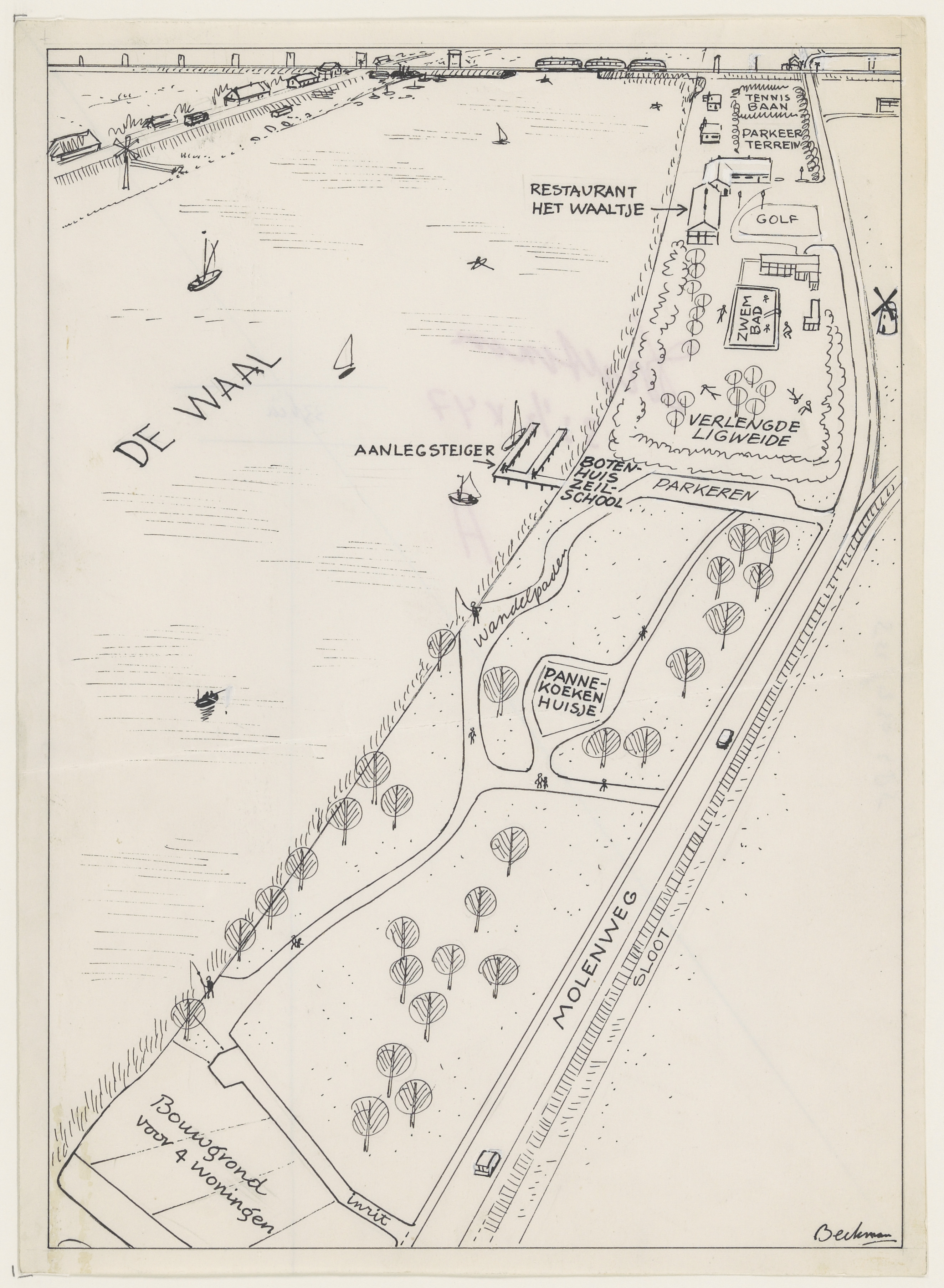 - Plan in vogelvlucht voor de inrichting van een recreatiegebied aan de zuidzijde van de Waal.