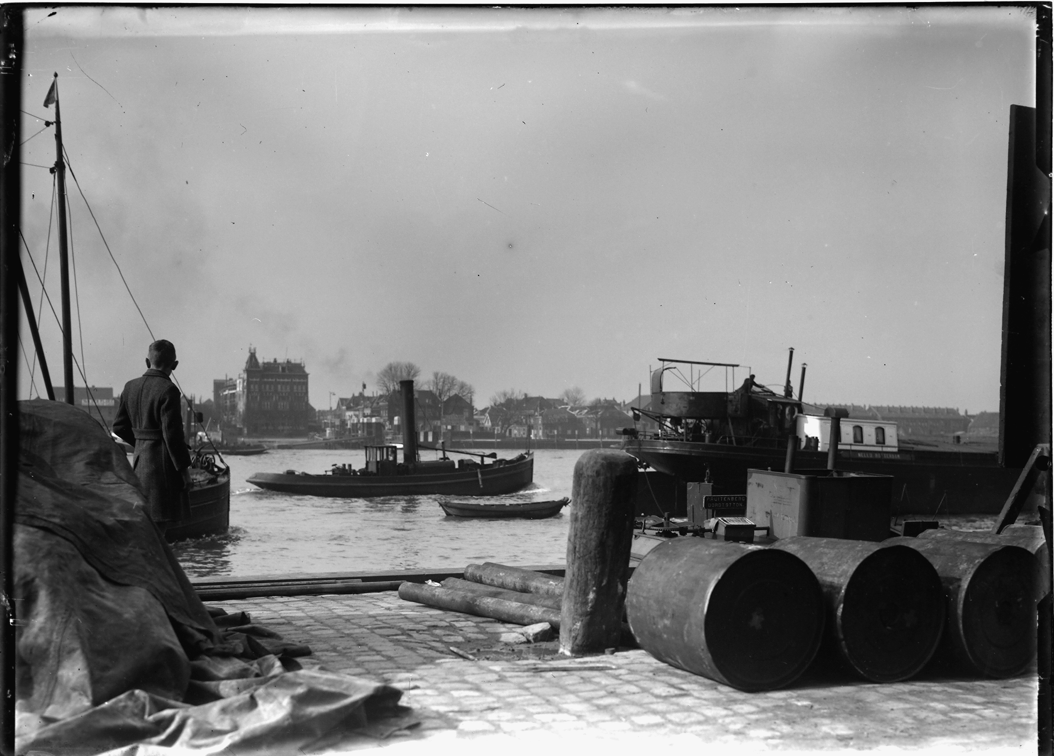 - Scheepvaart op de Oude Maas, gezien vanaf de Hooikade. Op de achtergrond Zwijndrecht met hotel Het Witte Paard aan het Veerplein.