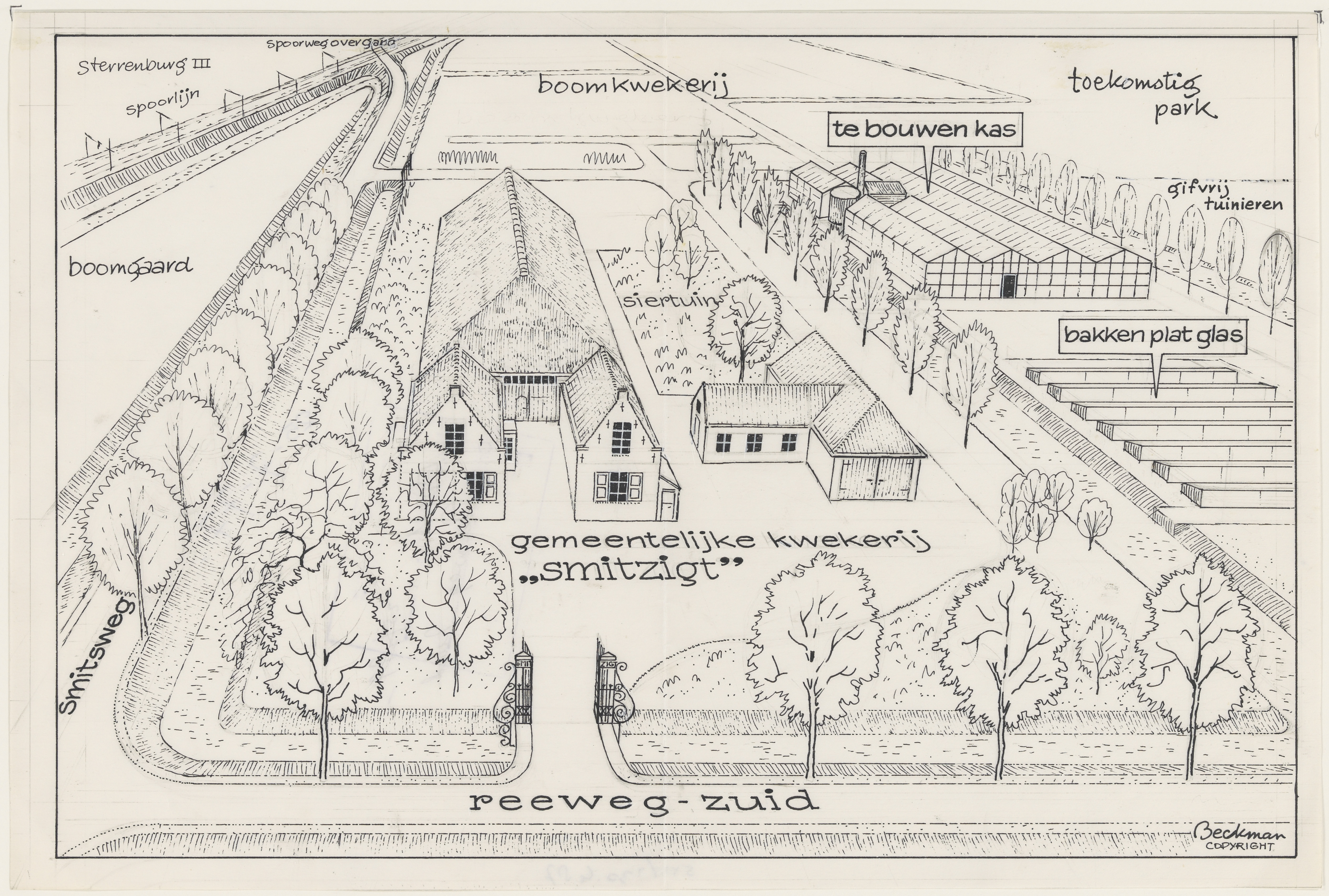 Plattegrond in vogelvlucht van de gemeentelijke kwekerij Smitzigt in de zuidelijke hoek …