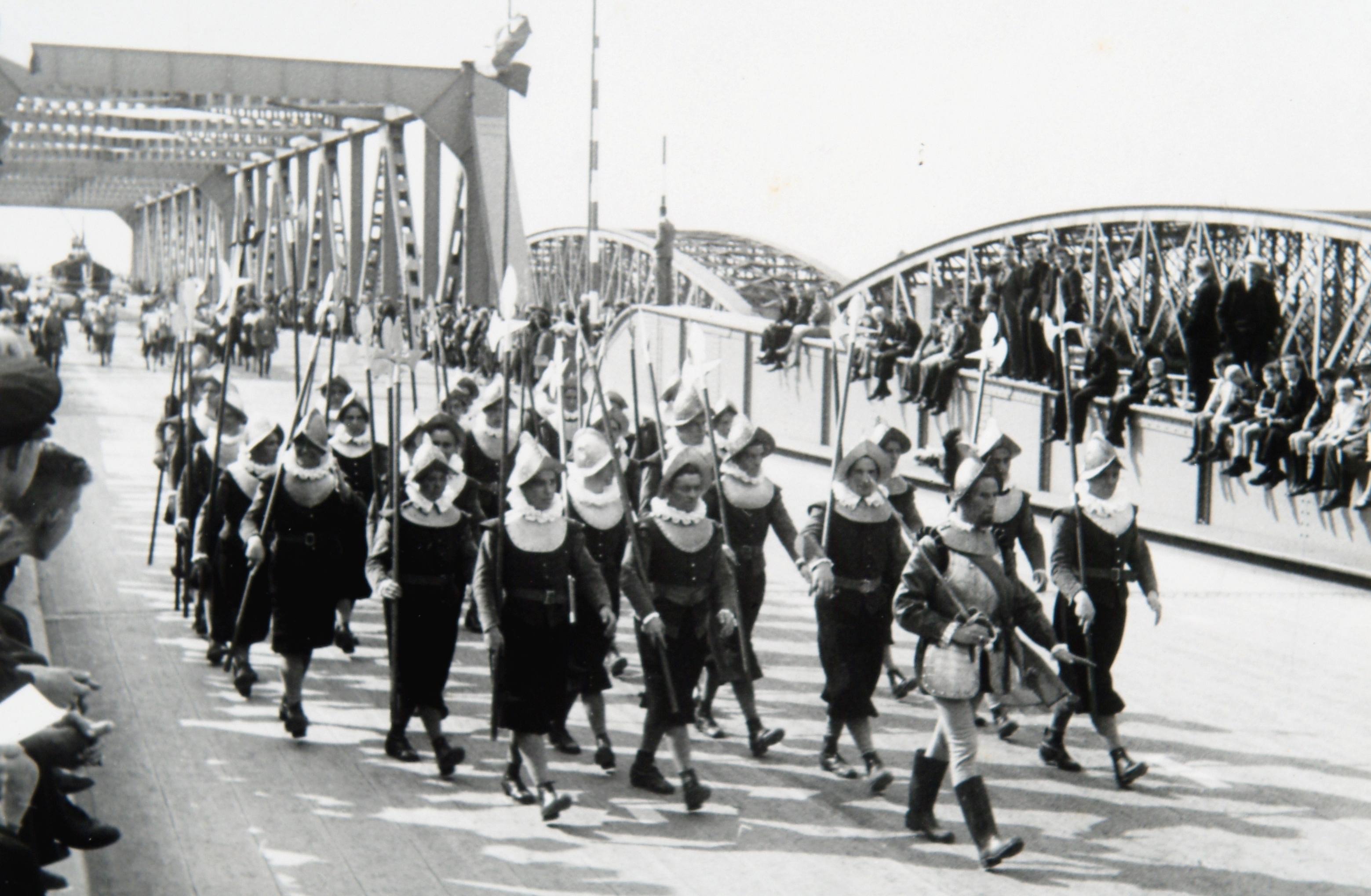 - Tafereel uit de optocht bij de "brugfeesten" t.g.v. de opening van de verkeersbrug over de Oude Maas. Rechts ligt de spoorbrug.