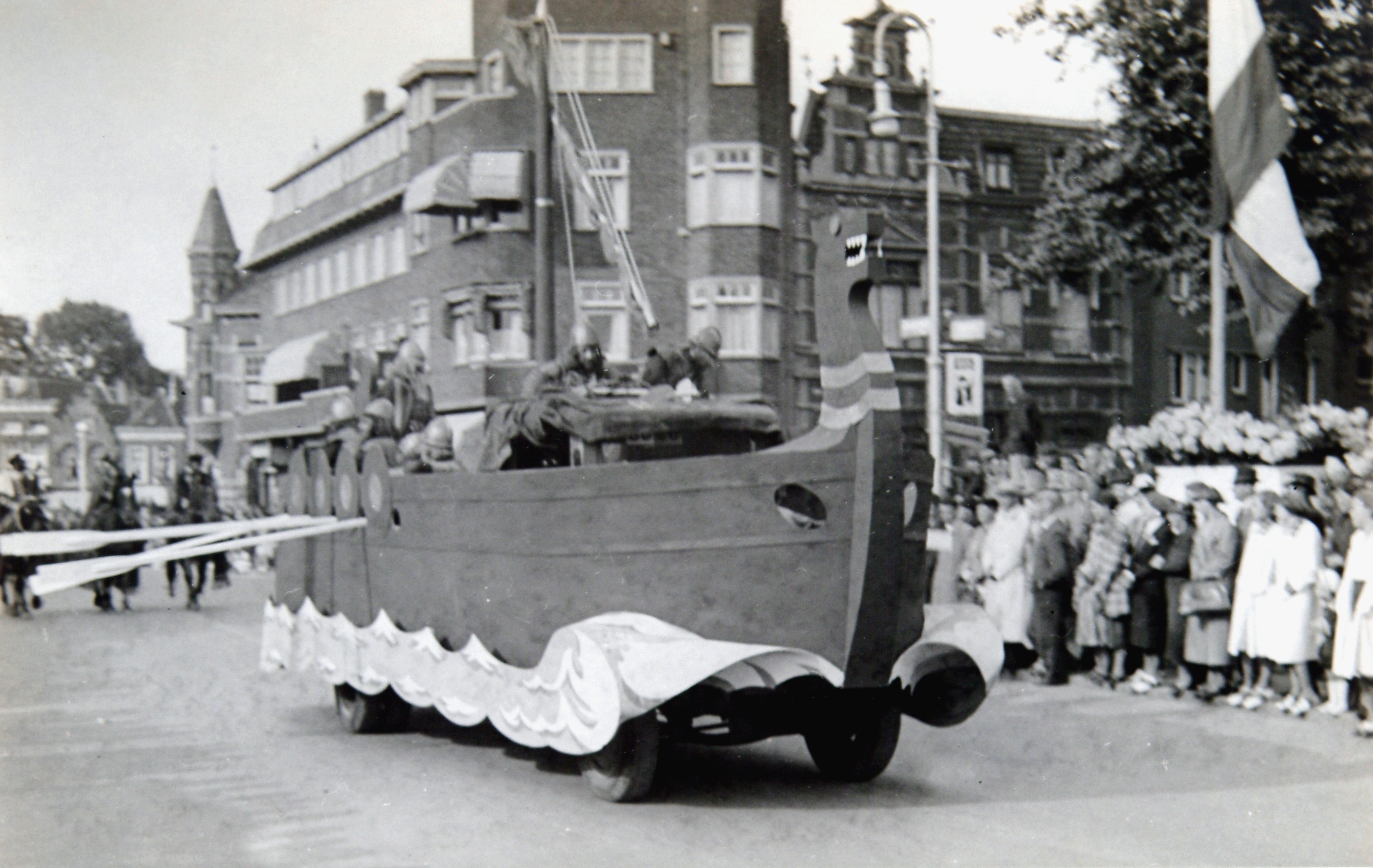 - Tafereel uit de optocht bij de "brugfeesten" t.g.v. de opening van de verkeersbrug over de Oude Maas. De stoet gaat over de Johan de Wittbrug in de richting van het station. De huizen rechts, staan aan de Vest.
