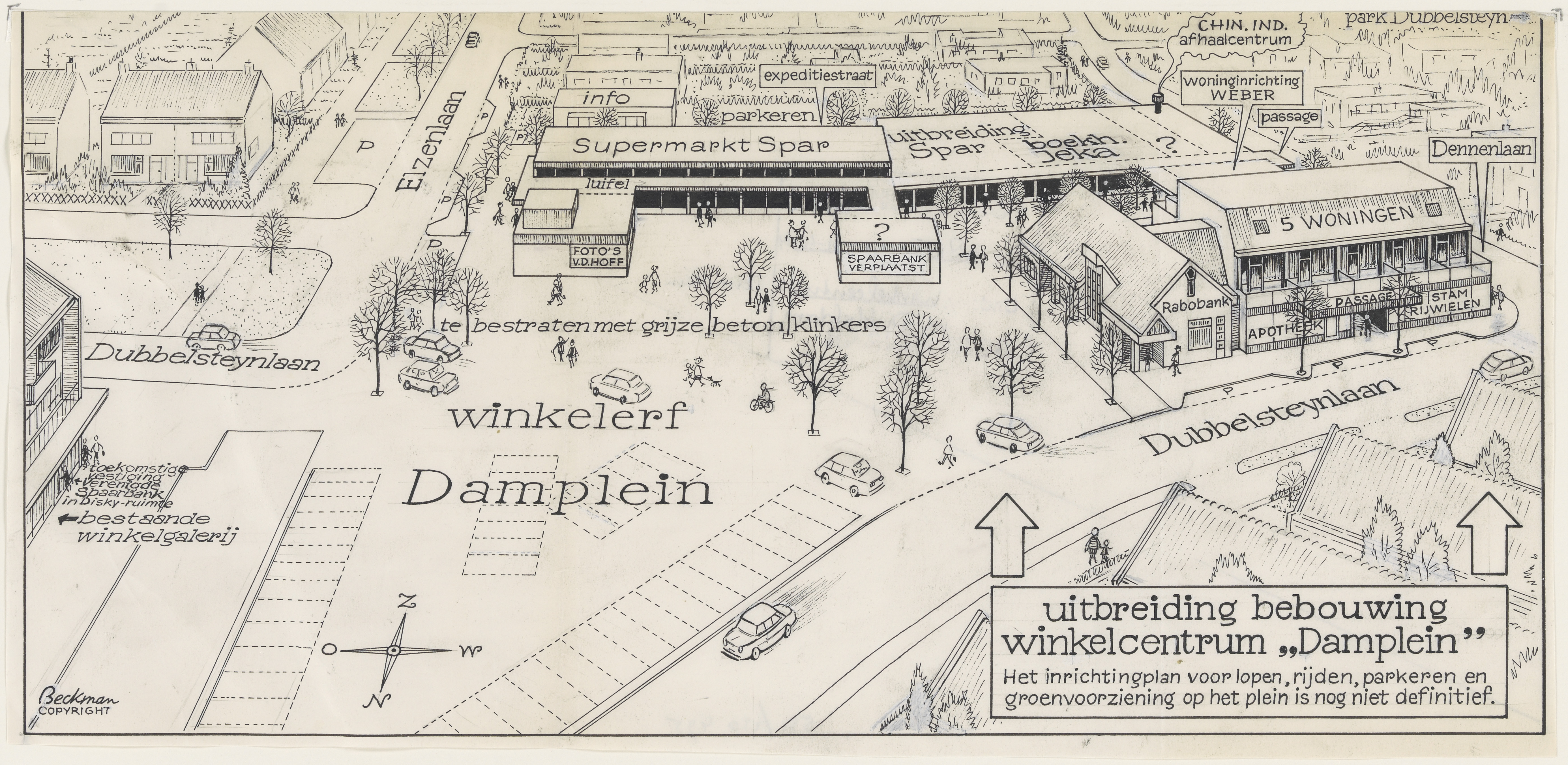- Plattegrond in vogelvlucht van de uitbreiding van het winkelcentrum Damplein in de wijk Dubbeldam.