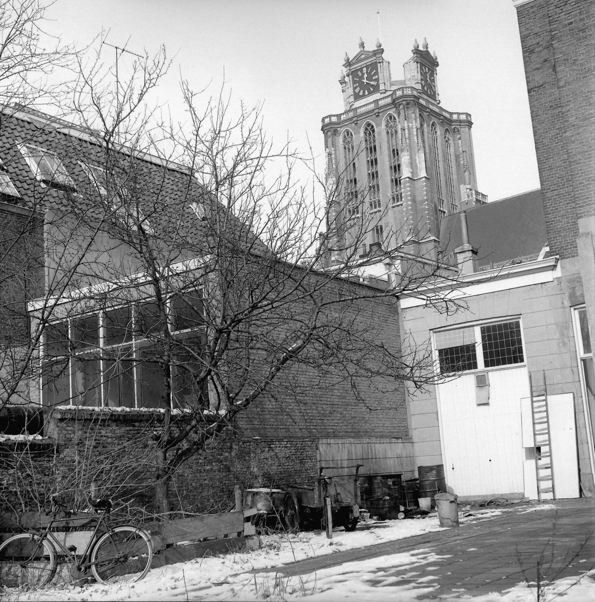- Een tuin in de Voorstraat met zicht op de Grote kerk