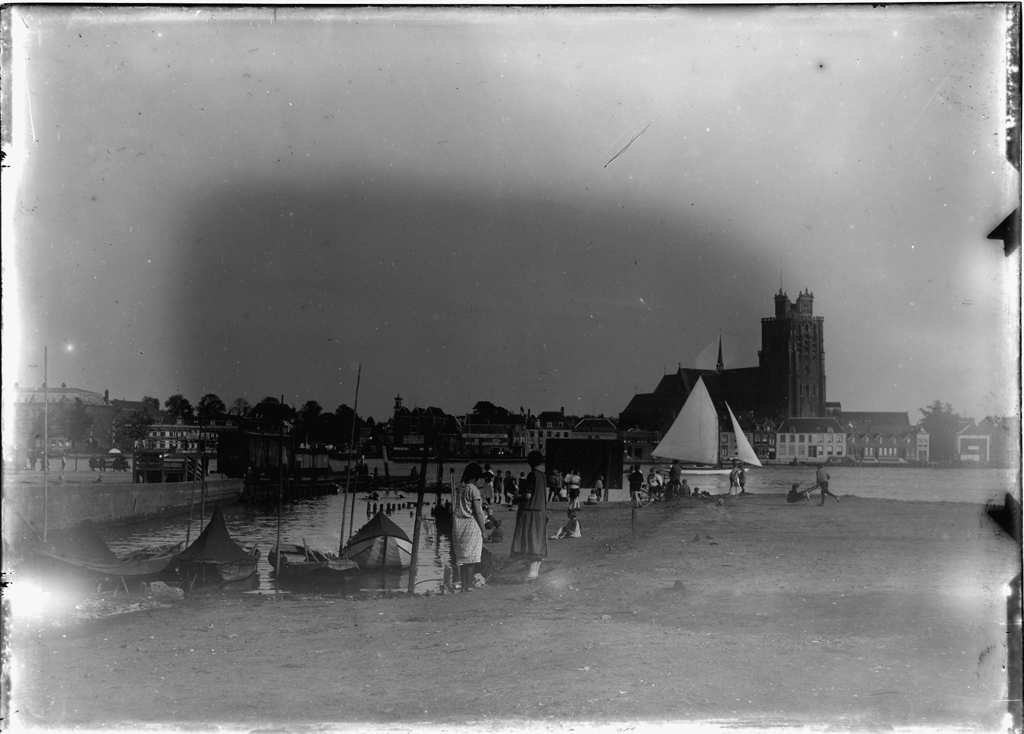 - Kijk op Dordrecht vanaf het Maasplein in Zwijndrecht. Links de Buiten Walevest met de pontonnierskazerne, rechts de Hooikade en de Grote Kerk op de achtergrond.