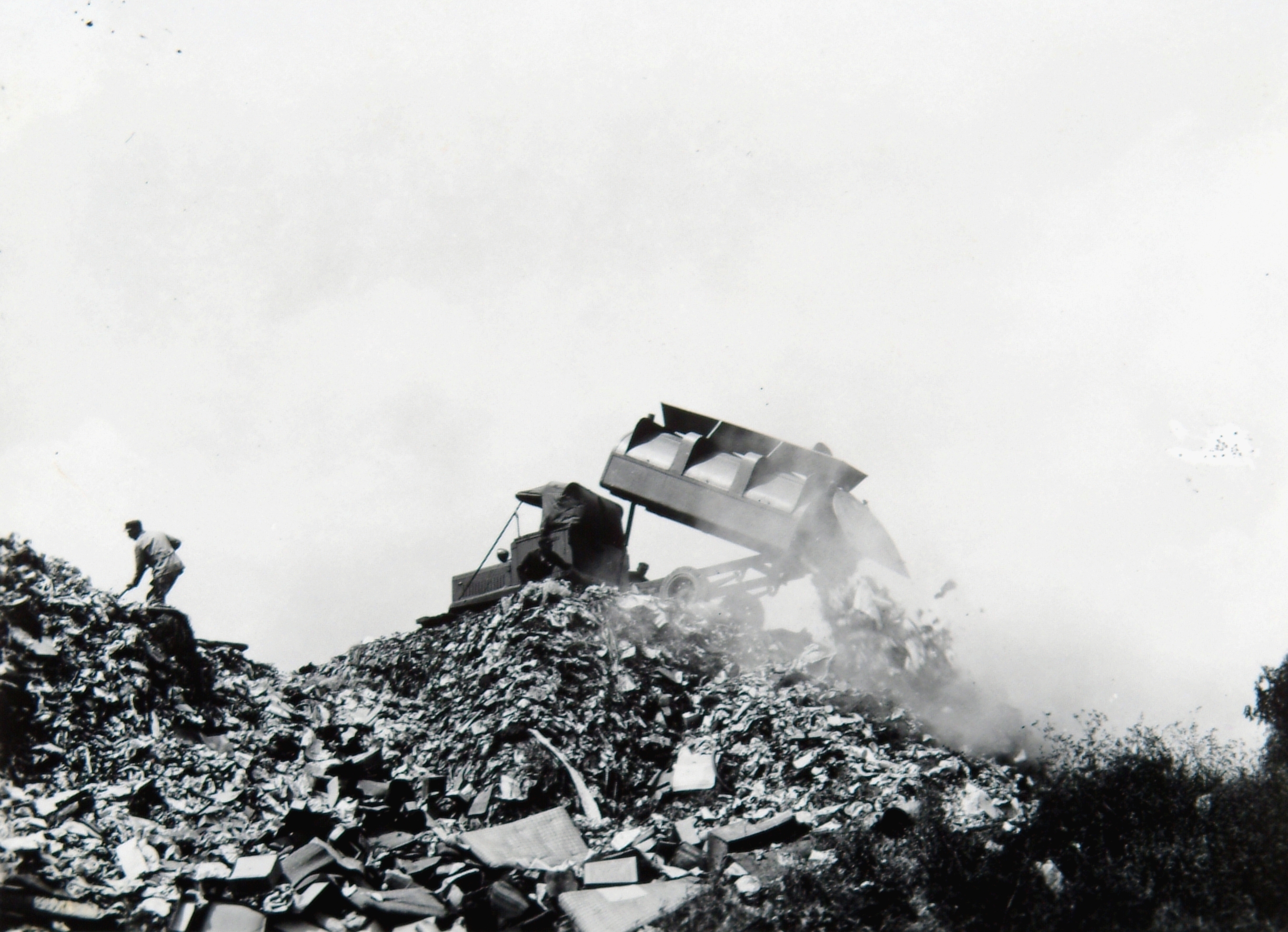 Storten van vuil op de oude vuilnisbelt aan de 's-Gravendeelsedijk.