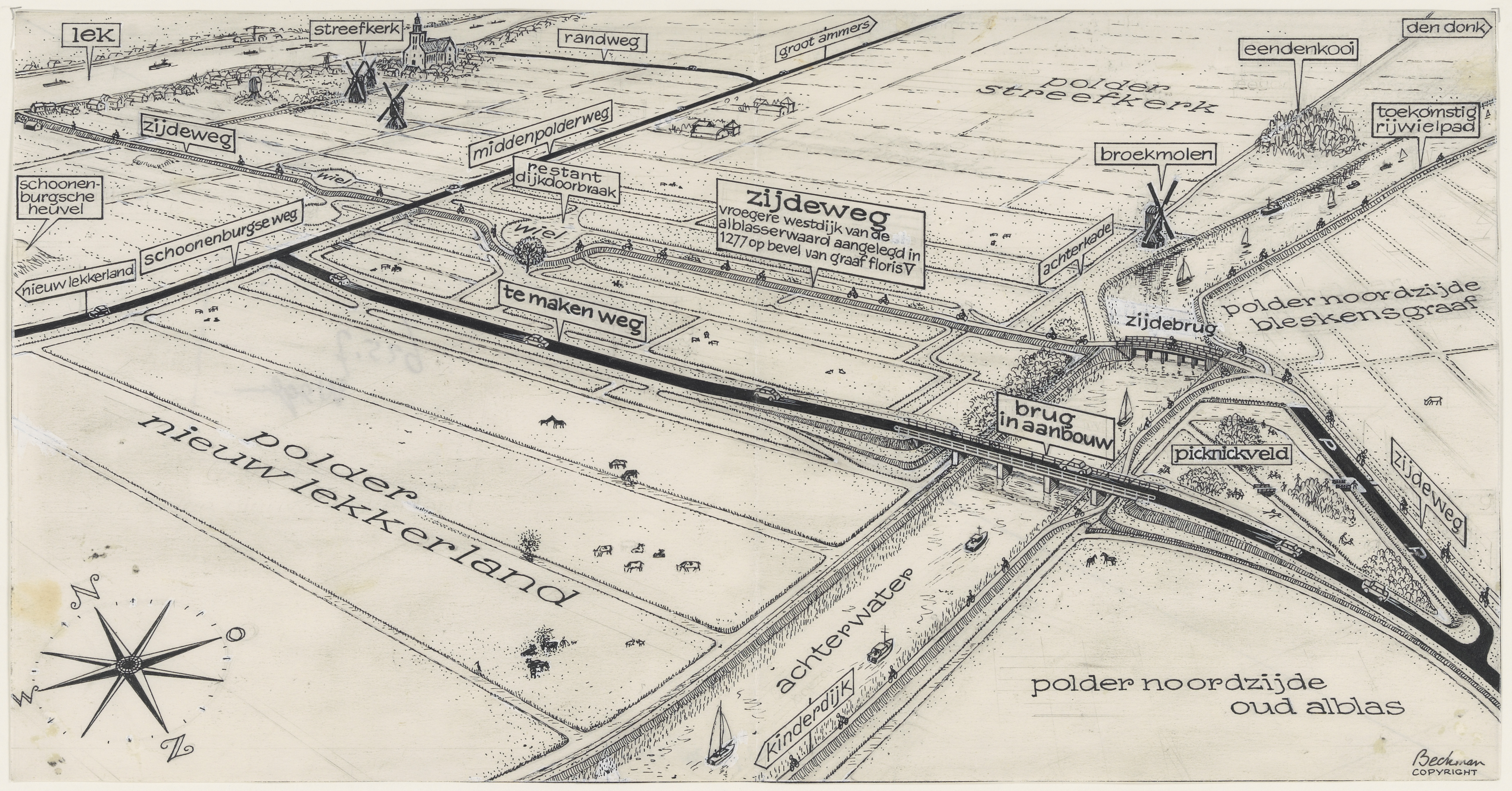 Kaart in vogelvlucht van een te maken autoweg en een fietspad over de Zijdeweg tussen de polder Nieuw-Lekkerland en de polder Streefkerk. Rechts de Zijdebrug, linksboven Streefkerk.