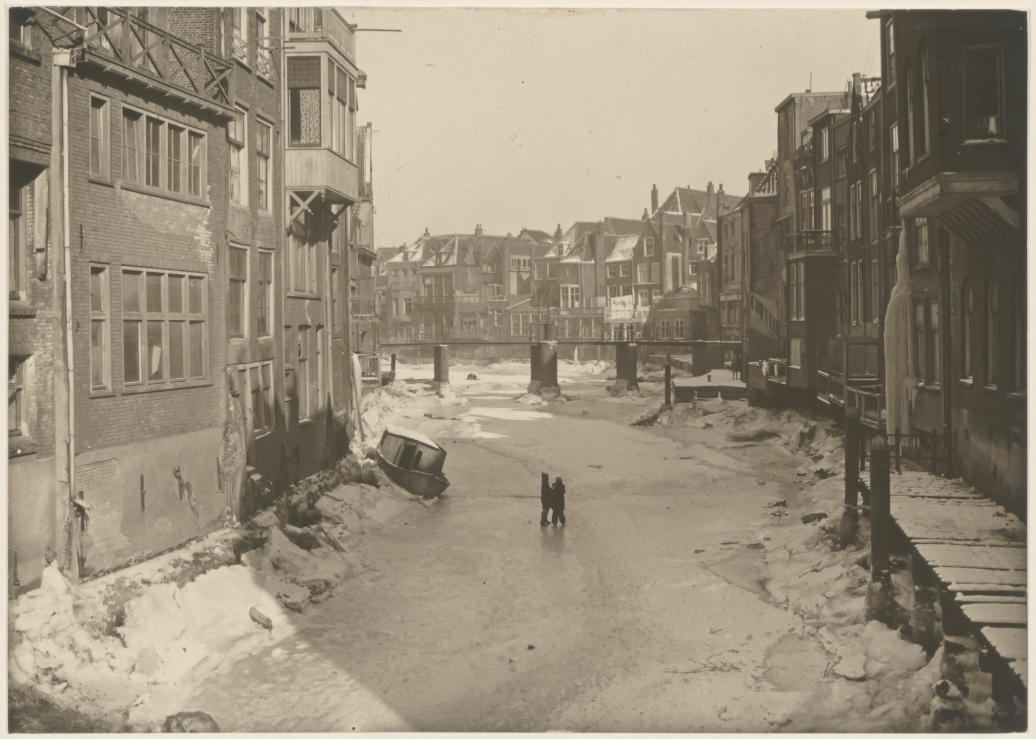 - Dichtgevroren Wijnhaven vanaf het Scheffersplein naar de Wijnbrug. Links de Wijnstraat, rechts de Voorstraat.
