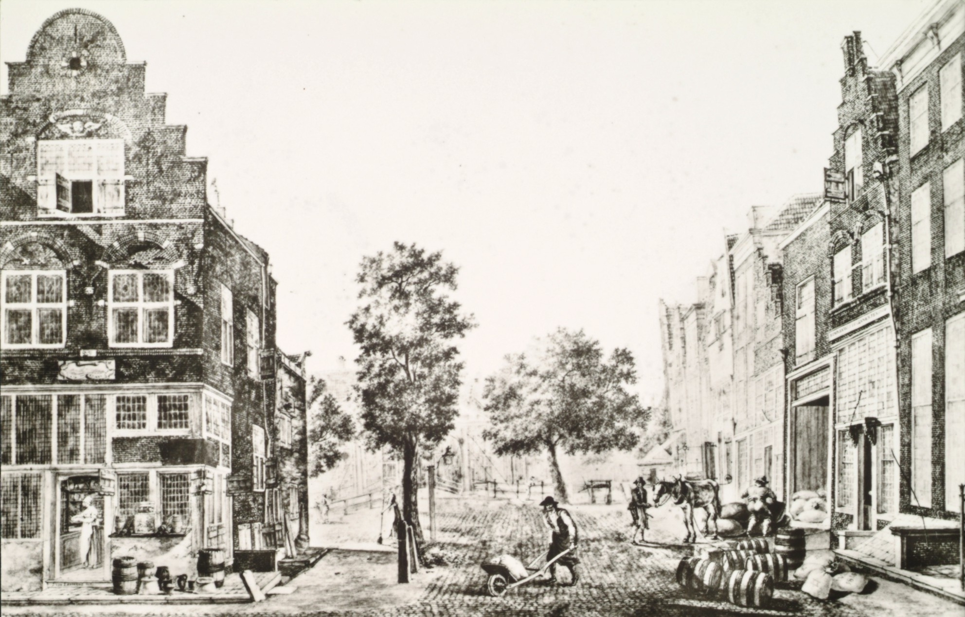 - Aquarel door J. van Lexmond van de Aardappelmarkt vanaf de Varkenmartkt richting Roobrug, omstreeks 1814.
