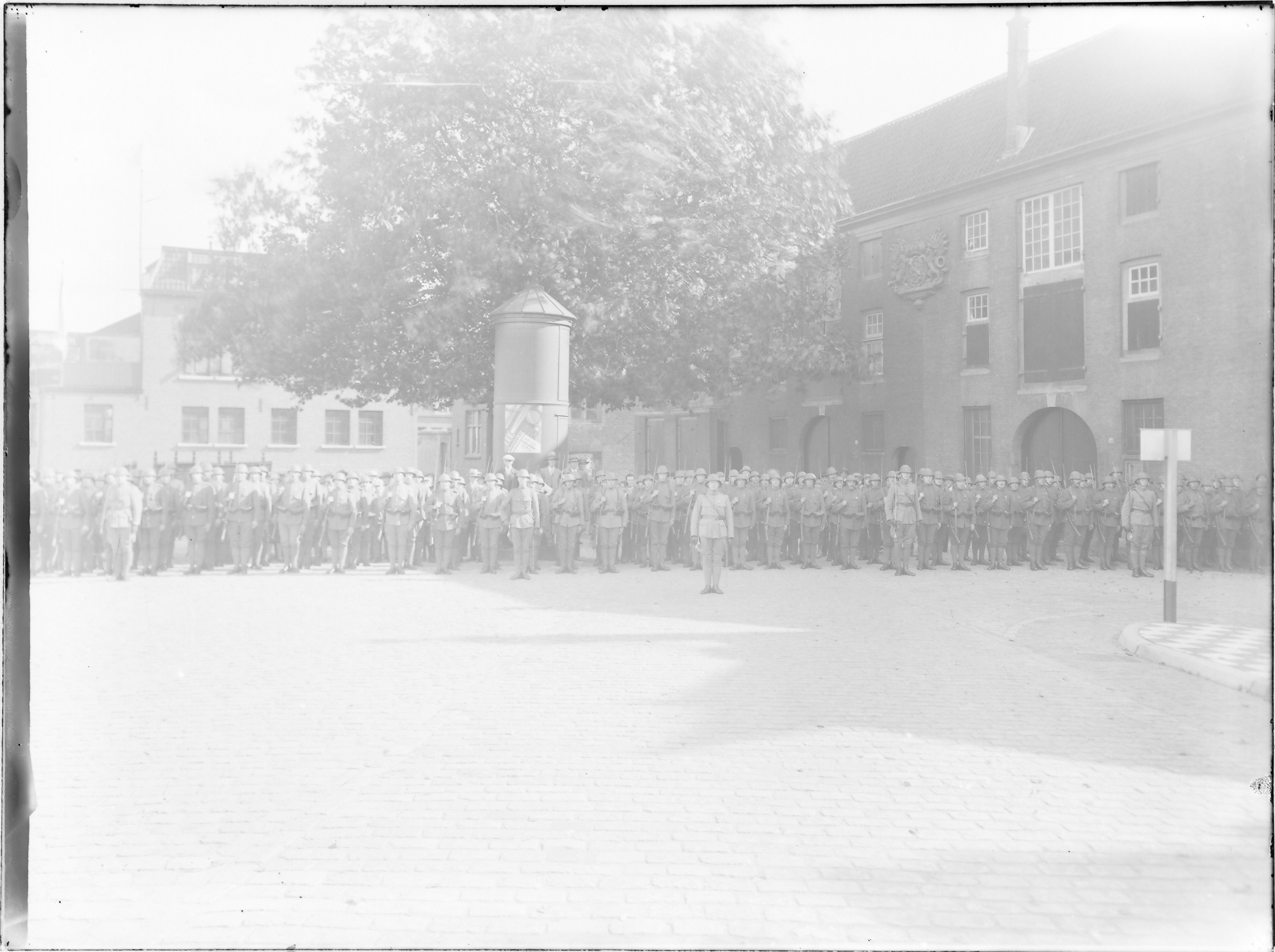 Groep pontonniers in het gelid voor het Rijksmagazijn aan de Houttuinen