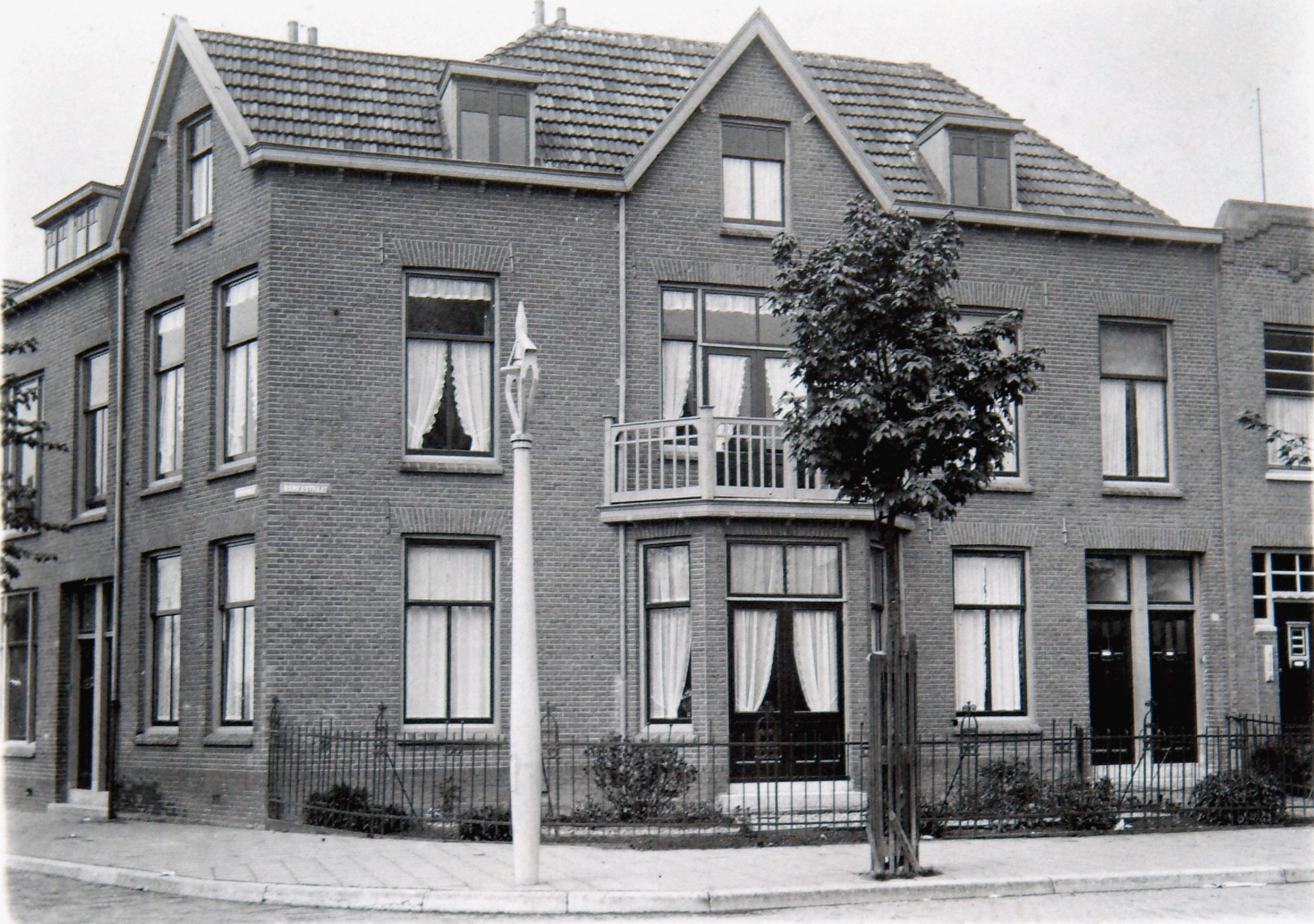 Gezicht op het huis op de hoek van de Bankastraat / Riouwstraat tegenover het Volksbadhuis.