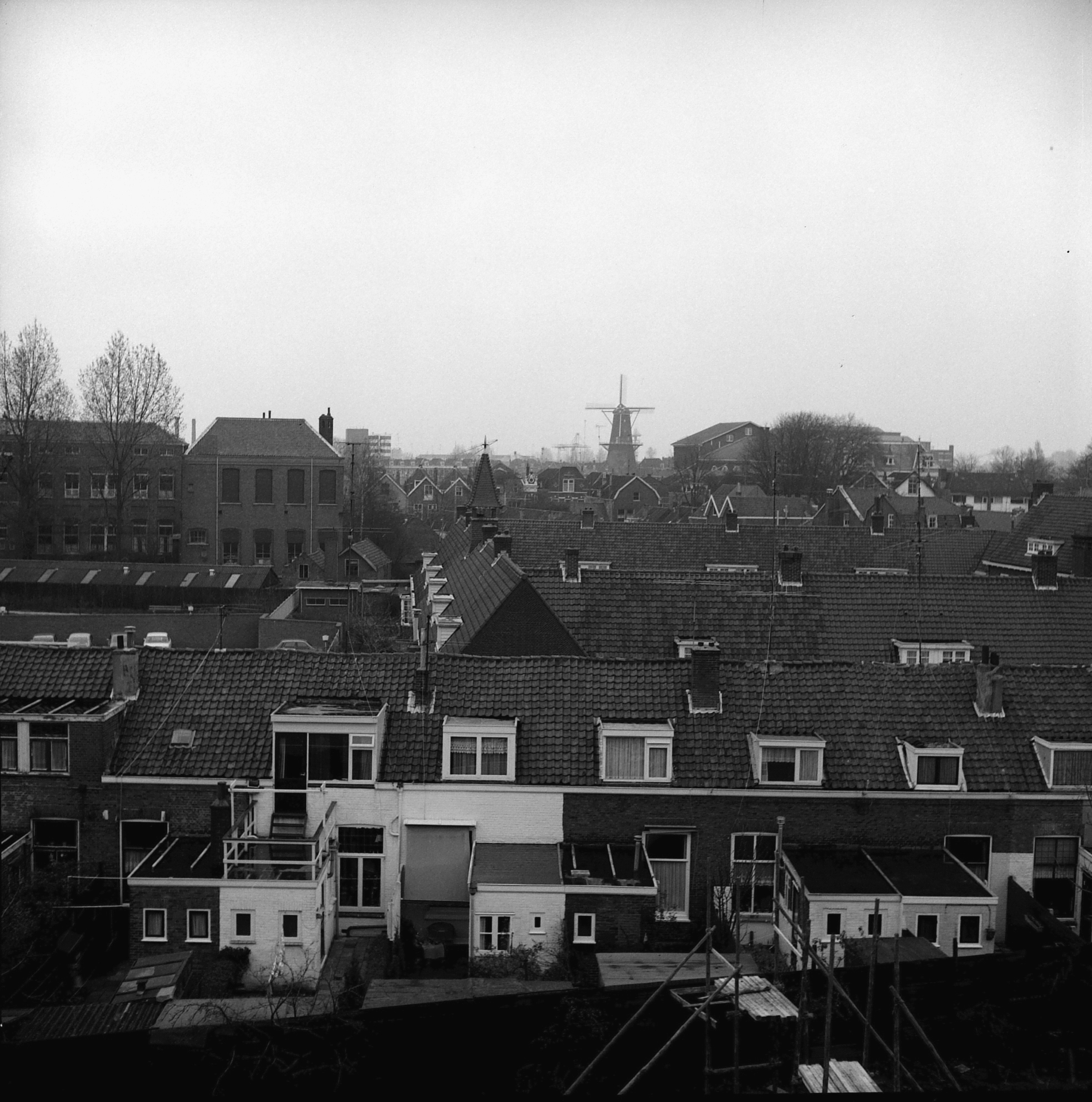 Meer specifiek: genomen vanaf het dak van het gebouw midden in het bouwblok Kromhout, Vrieseweg, Kasperspad en Warmoezierspad (Wilhelmina stichting?). Beneden huizen aan het Warmoezierspad, in de verte Kunstmin.