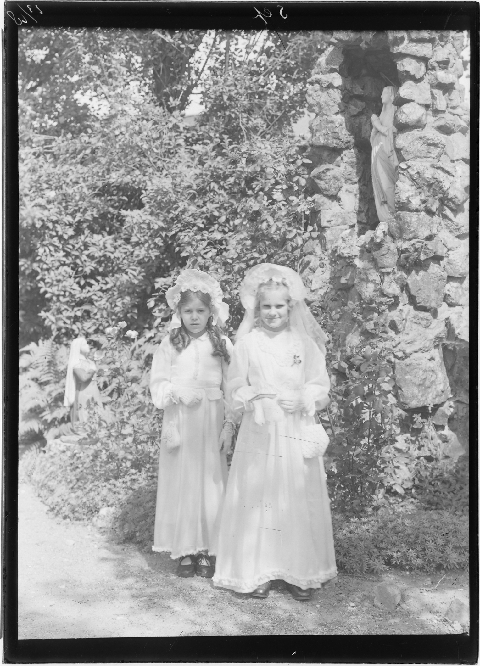 Eerste Heilige Communie van de zusjes Pols uit Rotterdam aan de Burgemeester de Raadtsingel. Ze zat op het Schippersinternaat
