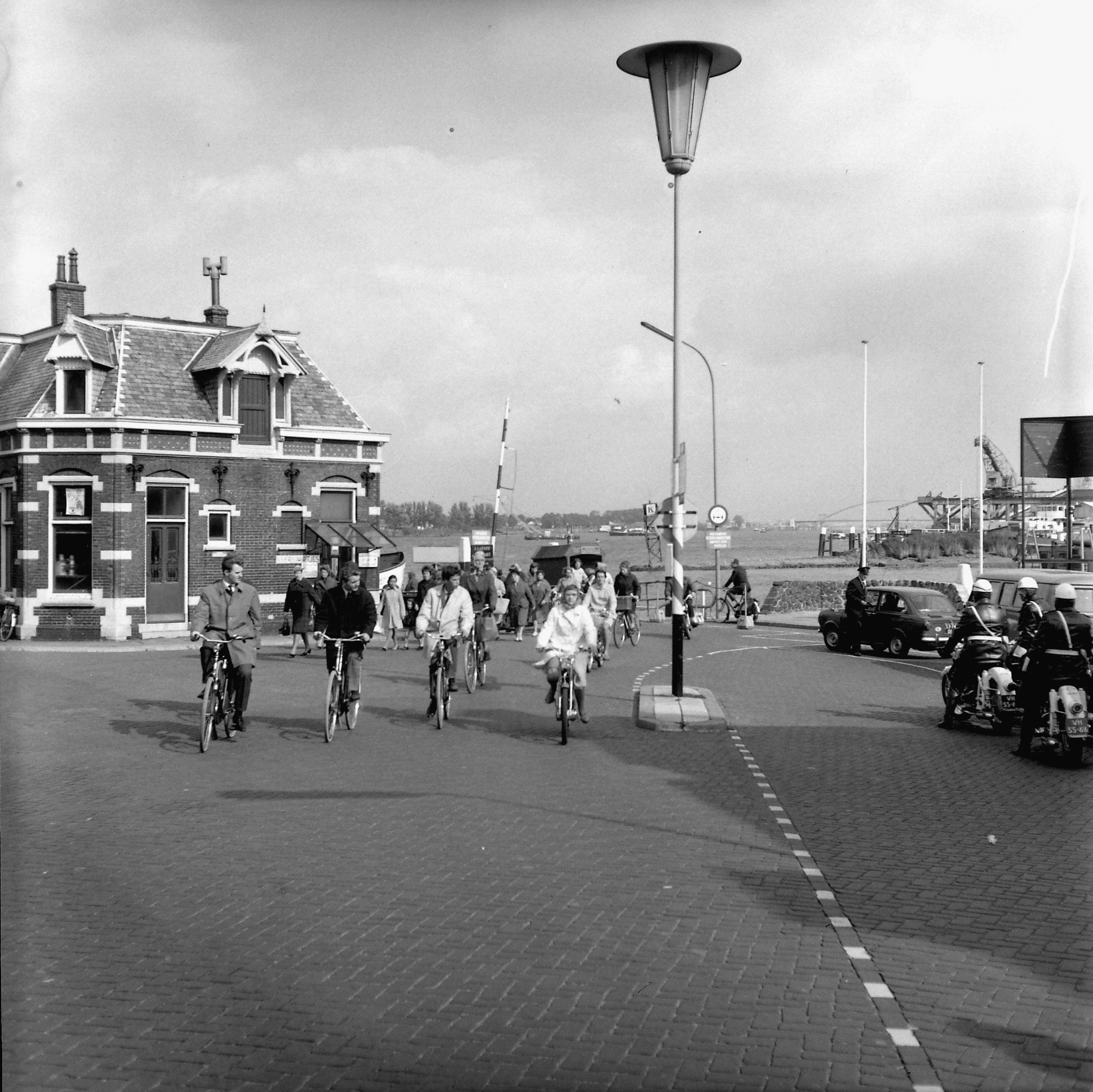 Mensen komend van het pontje vanuit Papendrecht. En wachtend om erop te mogen staan 3 …