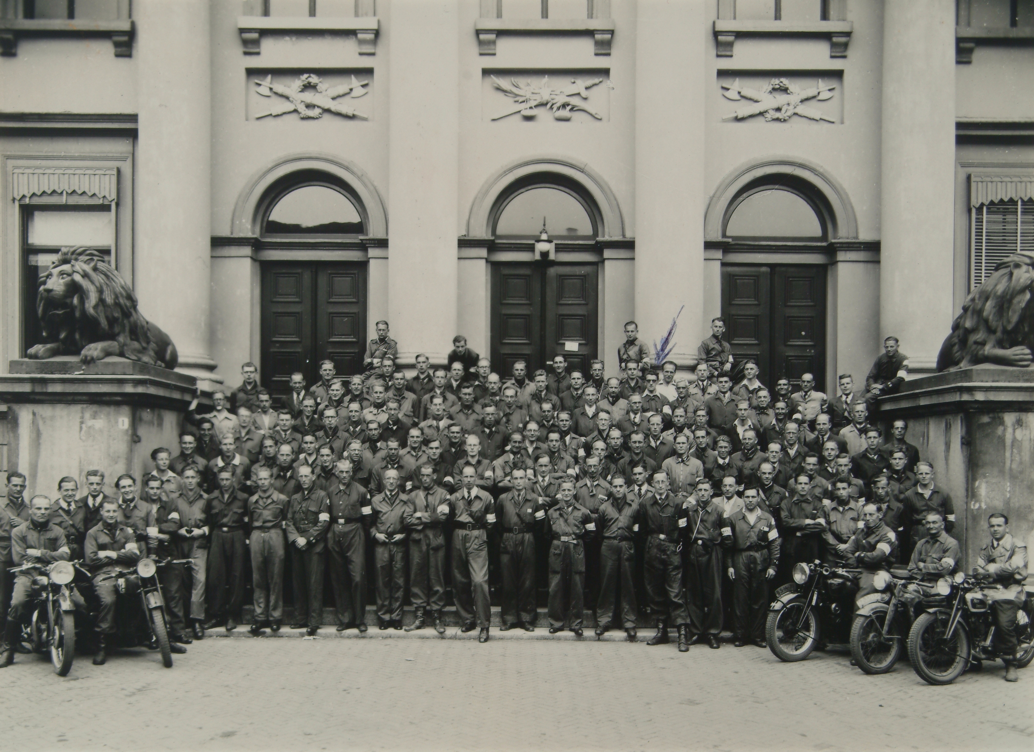 groepsportretten militairen / soldaten motorfietsen motorpolitie oorlogstijd stadhuizen Tweede Wereldoorlog