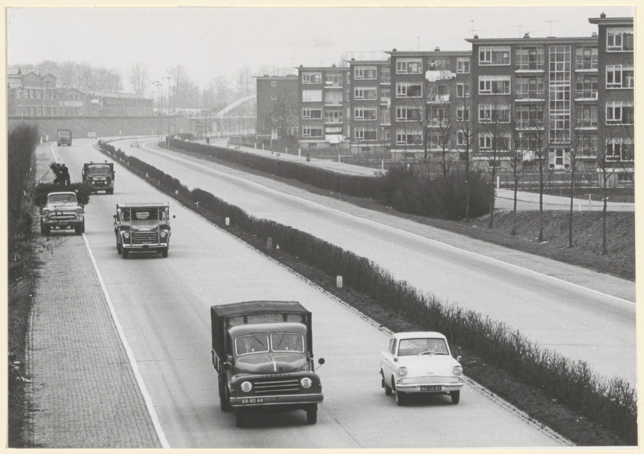 De Chevrolet vrachtwagen van Rijkswaterstaat staat op de parkeerstrook. De kantonniers van RWS zijn bezig met snoeiwerkzaamheden. Het snoeiafval wordt handmatig op de laadbak geladen. Met een gangetje van 60- tot 70 km/u passeren de vrachtwagens de wegwerkers. Voorop een Hanomag uit 1957, daarachter een Volvo, gevolgd door een Commer. Deze worden op hun beurt ingehaald door een Ford Anglia uit 1959.